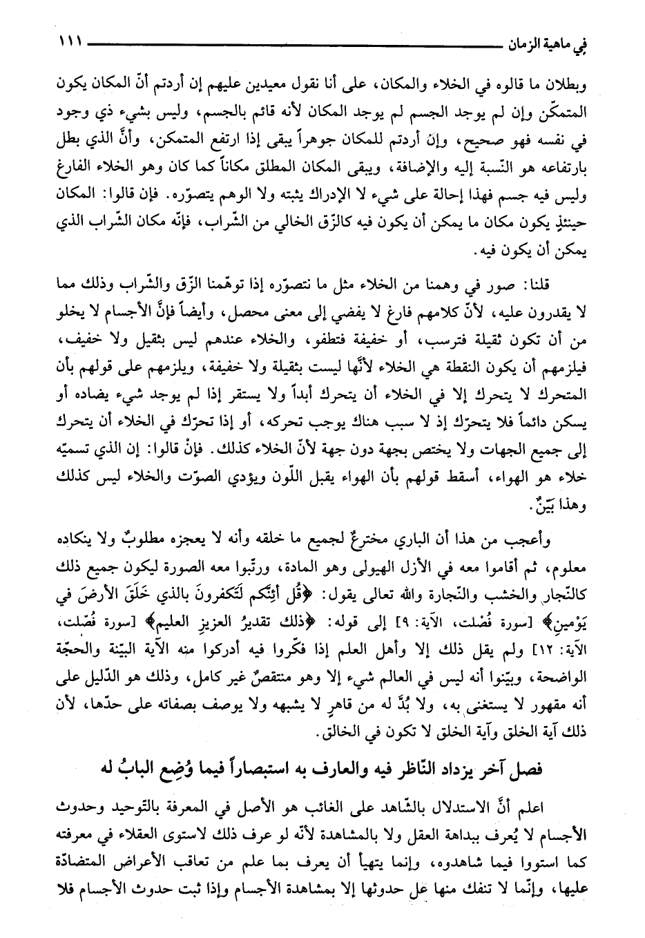 وبطلان ما قالوه في الخلاء والمكان، على أنا نقول معيدين عليهم إن أردتم أنّ المكان يكون المتمكّن وإن لم يوجد الجسم لم يوجد المكان لأنه قائم بالجسم، وليس بشيء ذي وجود في نفسه فهو صحيح، وإن أردتم للمكان جوهرا يبقى إذا ارتفع المتمكن، وأنّ الذي بطل بارتفاعه هو النّسبة إليه والإضافة، ويبقى المكان المطلق مكانا كما كان وهو الخلاء الفارغ وليس فيه جسم فهذا إحالة على شيء لا الإدراك يثبته ولا الوهم يتصوّره. فإن قالوا: المكان حينئذ يكون مكان ما يمكن أن يكون فيه كالزّق الخالي من الشّراب، فإنّه مكان الشّراب الذي يمكن أن يكون فيه.