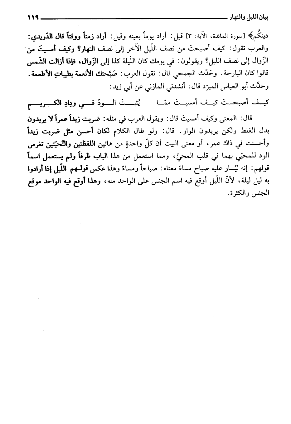 والعرب تقول: كيف أصبحت من نصف اللّيل الآخر إلى نصف النهار؟ وكيف أمسيت من الزّوال إلى نصف الليل؟ ويقولون: في يومك كان اللّيلة كذا إلى الزّوال، فإذا أزالت الشّمس قالوا كان البارحة. وحدّث الجمحي قال: تقول العرب: صبّحتك الأنعمة بطيبات الأطعمة.
