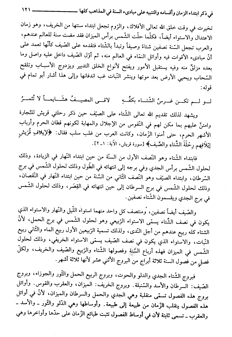 تخيرت في وقت خلق الله تعالى الأفلاك، والرّوم تجعل ابتداء سنتها من الخريف، وهو زمان الاعتدال والاستواء أيضا، فكلّما حلّت الشّمس برأس الميزان فقد مضت سنة للعالم عندهم، والعرب تجعل السّنة نصفين شتاء وصيفا وتبدأ بالشّتاء فتقدمه على الصّيف كأنّها تعمد على أنّ مبادئ الأقوات فيه وأوائل النّماء في العالم منه، ثم أوّل الصّيف داخل عليه واصل وما بعده مزلق منه وفيه يستقبل الأمور ويفتح لأنواع الخلق التدبير ويزدوج الأسباب وتلقح السّحاب ويحيي الأرض بعد موتها وينشر النّبات غب اندفانها وإلى هذا أشار أبو تمام في قوله: