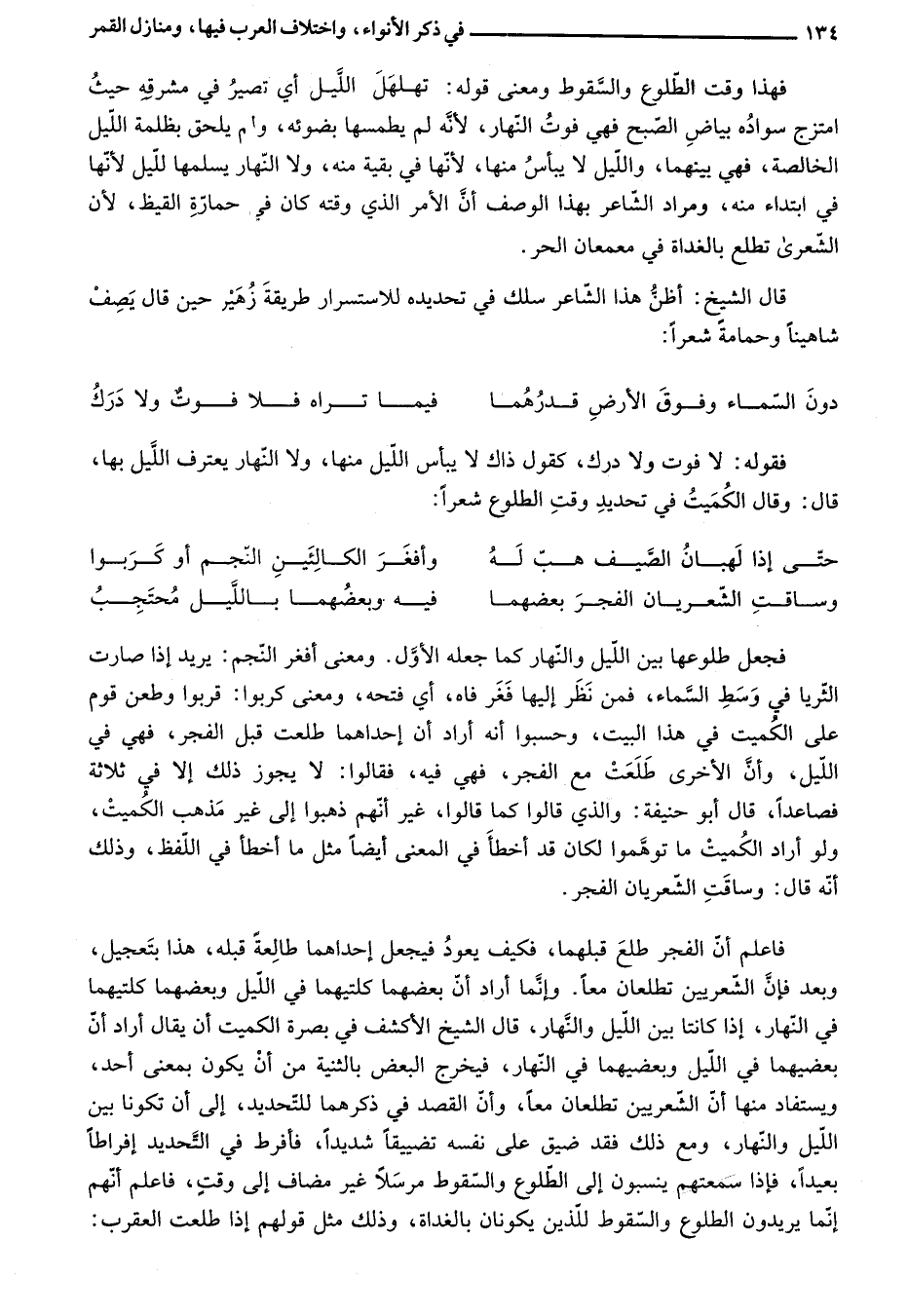 فاعلم أنّ الفجر طلع قبلهما، فكيف يعود فيجعل إحداهما طالعة قبله، هذا بتعجيل، وبعد فإنّ الشّعريين تطلعان معا. وإنّما أراد أنّ بعضهما كلتيهما في اللّيل وبعضهما كلتيهما في النّهار، إذا كانتا بين اللّيل والنّهار، قال الشيخ الأكشف في بصرة الكميت أن يقال أراد أنّ بعضيهما في اللّيل وبعضيهما في النّهار، فيخرج البعض بالثنية من أن يكون بمعنى أحد، ويستفاد منها أنّ الشّعريين تطلعان معا، وأنّ القصد في ذكرهما للتّحديد، إلى أن تكونا بين اللّيل والنّهار، ومع ذلك فقد ضيق على نفسه تضييقا شديدا، فأفرط في التّحديد إفراطا بعيدا، فإذا سمعتهم ينسبون إلى الطّلوع والسّقوط مرسلا غير مضاف إلى وقت، فاعلم أنّهم إنّما يريدون الطلوع والسّقوط للّذين يكونان بالغداة، وذلك مثل قولهم إذا طلعت العقرب: