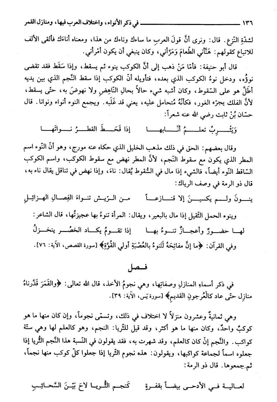 قال أبو حنيفة: فأمّا من ذهب إلى أنّ الكوكب ينوء ثم يسقط، وإذا سقط فقد تقضى نوؤه، ودخل نوء الكوكب الذي بعده، فتأويله أنّ الكوكب إذا سقط النّجم الذي بين يديه أطلّ هو على السّقوط، وكان أشبه شيء حالا بحال النّاهض ولا نهوض به، حتّى يسقط، لأنّ الفلك يجرّه الغور، فكأنّه متحامل عليه، يعني قد غلبه. ويجمع النوء أنواء ونوانا. قال حسّان بن ثابت رضي الله عنه شعرا: