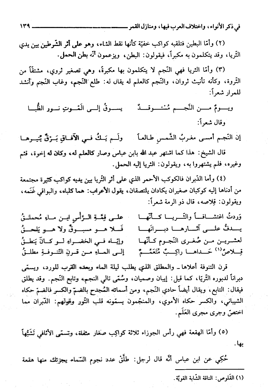 (4) وأما الدّبران فالكوكب الأحمر الذي على أثر الثّريا بين يديه كواكب كثيرة مجتمعة من أدناها إليه كوكبان صغيران يكادان يلتصقان، يقول الأعراب: هما كلباه، والبواقي غنمه، ويقولون: قلاصه، قال ذو الرمة شعرا: