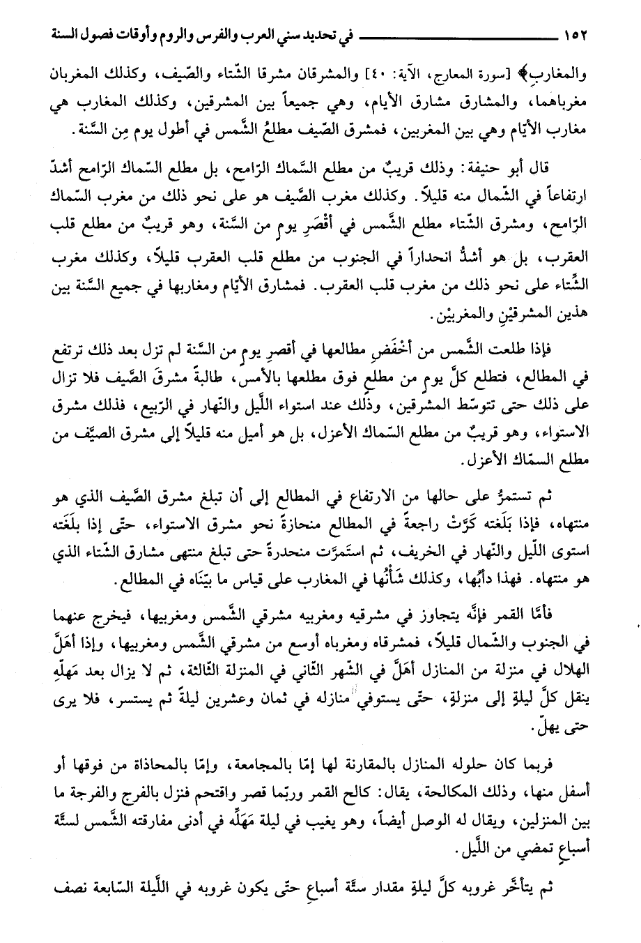 قال أبو حنيفة: وذلك قريب من مطلع السّماك الرّامح، بل مطلع السّماك الرّامح أشدّ ارتفاعا في الشّمال منه قليلا. وكذلك مغرب الصّيف هو على نحو ذلك من مغرب السّماك الرّامح، ومشرق الشّتاء مطلع الشّمس في أقصر يوم من السّنة، وهو قريب من مطلع قلب العقرب، بل هو أشدّ انحدارا في الجنوب من مطلع قلب العقرب قليلا، وكذلك مغرب الشّتاء على نحو ذلك من مغرب قلب العقرب. فمشارق الأيّام ومغاربها في جميع السّنة بين هذين المشرقين والمغربين.