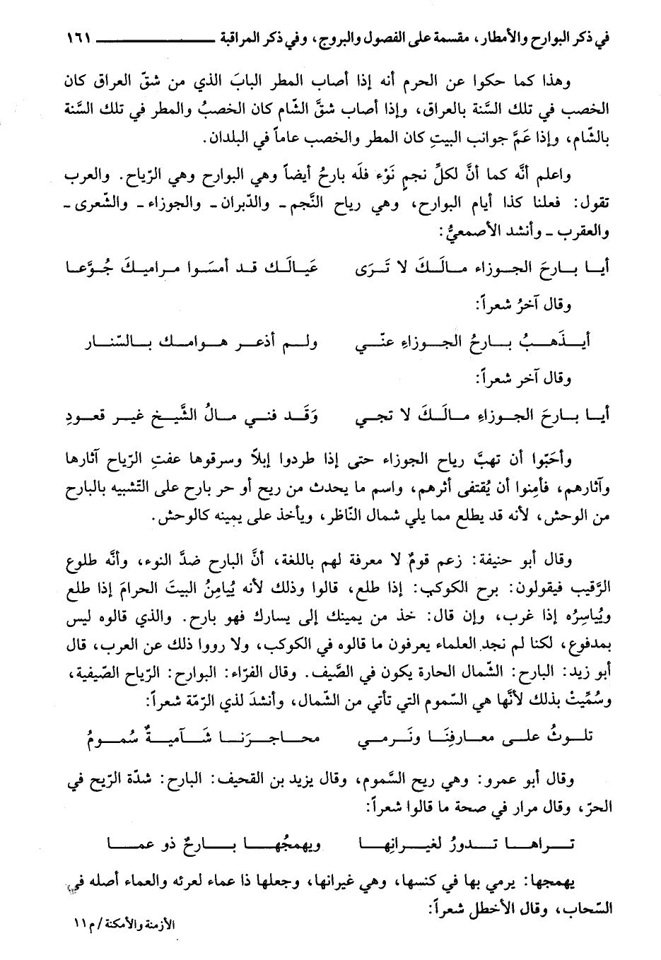 واعلم أنّه كما أنّ لكلّ نجم نوء فله بارح أيضا وهي البوارح وهي الرّياح. والعرب تقول: فعلنا كذا أيام البوارح، وهي رياح النّجم- والدّبران- والجوزاء- والشّعرى- والعقرب- وأنشد الأصمعيّ: