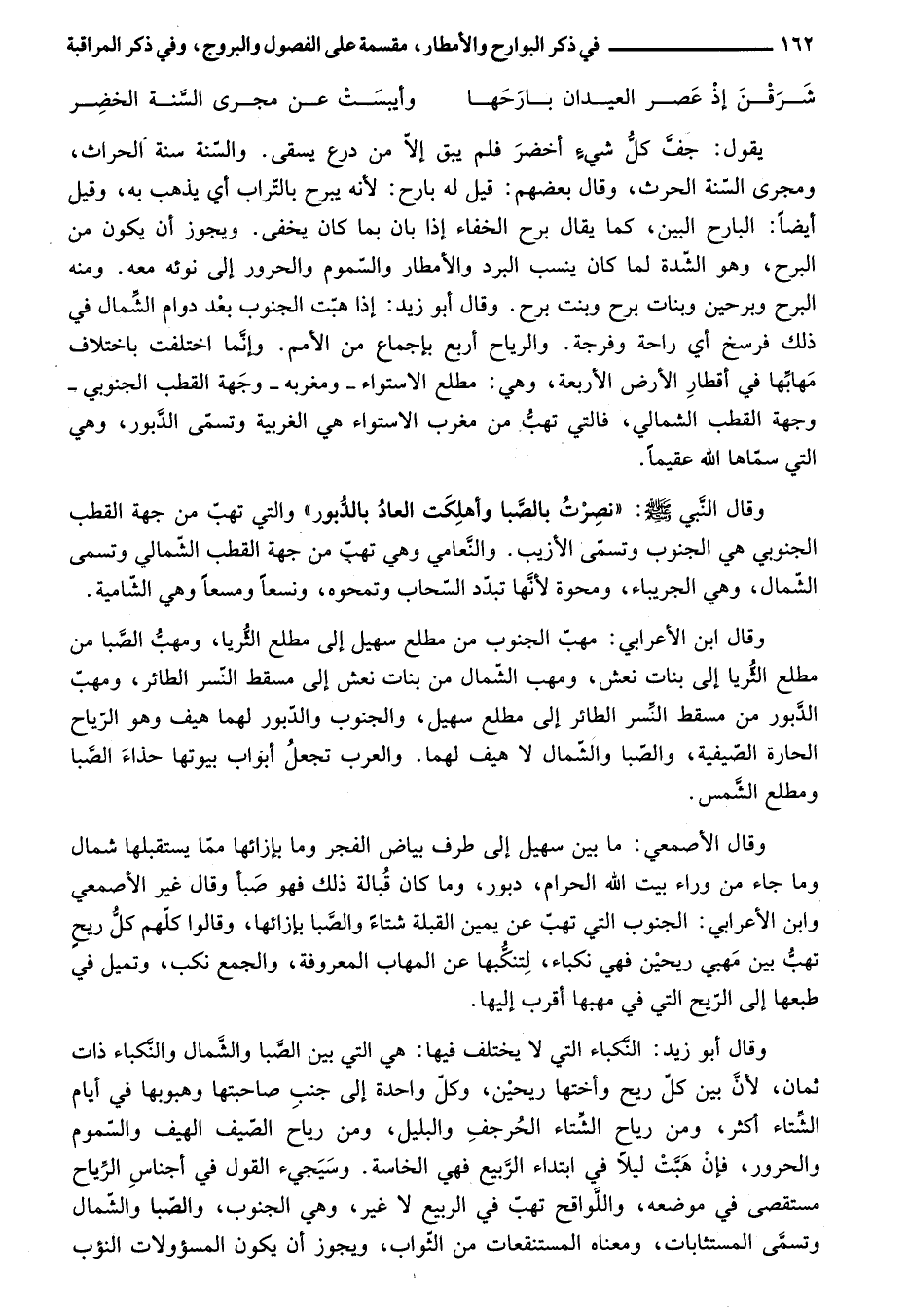 يقول: جفّ كلّ شيء أخضر فلم يبق إلّا من درع يسقى. والسّنة سنة الحراث، ومجرى السّنة الحرث، وقال بعضهم: قيل له بارح: لأنه يبرح بالتّراب أي يذهب به، وقيل أيضا: البارح البين، كما يقال برح الخفاء إذا بان بما كان يخفى. ويجوز أن يكون من البرح، وهو الشّدة لما كان ينسب البرد والأمطار والسّموم والحرور إلى نوئه معه. ومنه البرح وبرحين وبنات برح وبنت برح. وقال أبو زيد: إذا هبّت الجنوب بعد دوام الشّمال في ذلك فرسخ أي راحة وفرجة. والرياح أربع بإجماع من الأمم. وإنّما اختلفت باختلاف مهابّها في أقطار الأرض الأربعة، وهي: مطلع الاستواء- ومغربه- وجهة القطب الجنوبي- وجهة القطب الشمالي، فالتي تهبّ من مغرب الاستواء هي الغربية وتسمّى الدّبور، وهي التي سمّاها الله عقيما.