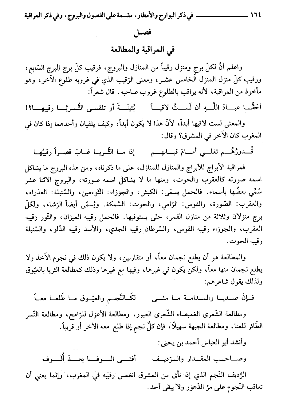 ومطالعة الشّعرى الغميصاء الشّعرى العبور، ومطالعة الأعزل للرّامح، ومطالعة النّسر الطّائر للعنا، ومطالعة الجبهة سهيلا، فإن كلّ نجم إذا طلع معه الآخر أو قريبا.