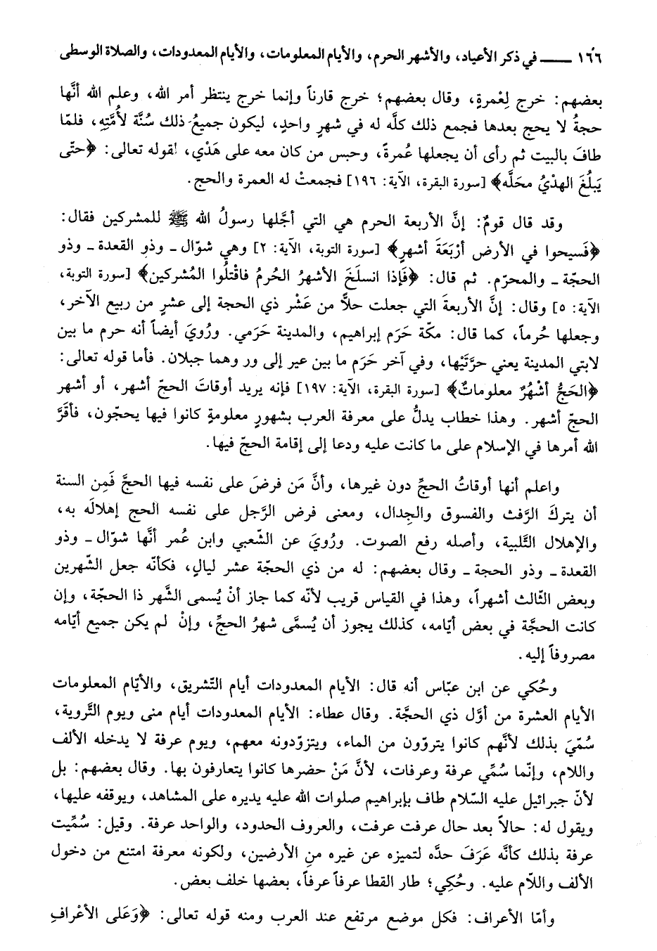 وحكي عن ابن عبّاس أنه قال: الأيام المعدودات أيام التّشريق، والأيّام المعلومات الأيام العشرة من أوّل ذي الحجّة. وقال عطاء: الأيام المعدودات أيام منى ويوم التّروية، سمّي بذلك لأنّهم كانوا يتروّون من الماء، ويتزوّدونه معهم، ويوم عرفة لا يدخله الألف واللام، وإنّما سمّي عرفة وعرفات، لأنّ من حضرها كانوا يتعارفون بها. وقال بعضهم: بل لأنّ جبرائيل عليه السّلام طاف بإبراهيم صلوات الله عليه يديره على المشاهد، ويوقفه عليها، ويقول له: حالا بعد حال عرفت عرفت، والعروف الحدود، والواحد عرفة. وقيل: سمّيت عرفة بذلك كأنّه عرف حدّه لتميزه عن غيره من الأرضين، ولكونه معرفة امتنع من دخول الألف واللّام عليه. وحكي؛ طار القطا عرفا عرفا، بعضها خلف بعض.