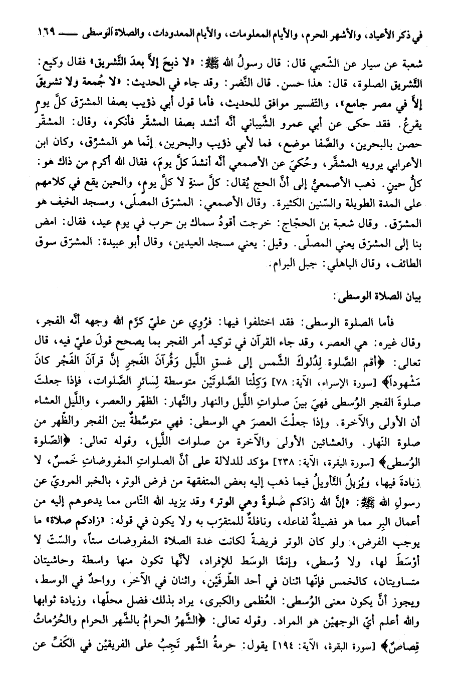 [سورة البقرة، الآية: 238] مؤكد للدلالة على أنّ الصلوات المفروضات خمس، لا زيادة فيها، ويزيل التّأويل فيما ذهب إليه بعض المتفقهة من فرض الوتر، بالخبر المرويّ عن رسول الله صلى الله عليه وسلم: «إنّ الله زادكم صلوة وهي الوتر» وقد يزيد الله النّاس مما يدعوهم إليه من أعمال البر مما هو فضيلة لفاعله، ونافلة للمتقرّب به ولا يكون في قوله: «زادكم صلاة» ما يوجب الفرض، ولو كان الوتر فريضة لكانت عدة الصلاة المفروضات ستا، والسّتّ لا أوسط لها، ولا وسطى، وإنّما الوسط للإفراد، لأنّها تكون منها واسطة وحاشيتان متساويتان، كالخمس فإنّها اثنان في أحد الطّرفين، واثنان في الآخر، وواحد في الوسط، ويجوز أنّ يكون معنى الوسطى: العظمى والكبرى، يراد بذلك فضل محلّها، وزيادة ثوابها والله أعلم أيّ الوجهين هو المراد. وقوله تعالى: الشَّهْرُ الْحَرامُ بِالشَّهْرِ الْحَرامِ وَالْحُرُماتُ قِصاصٌ