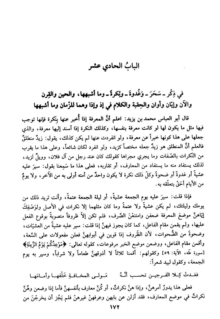 والحين والقرن والآن وإيّان وأوان والحقبة والكلام في إذ وإذا وهما للزّمان وما أشبهها قال أبو العباس محمد بن يزيد: اعلم أنّ المعرفة إذا أخبر عنها بنكرة فإنها توجب فيها مثل ما يكون لها لو كانت معرفة بنفسها، وكذلك النكرة إذا أسند إليها معرفة، والذي جعلها على هذا كونها خبرا عن معرفة، ولو انفردت عنها لم يكن كذلك، يقول: زيد منطلق فالعلم أنّ المنطلق هو زيد جعله مختصا كزيد، ولو انفرد لكان شائعا، وعلى هذا ما يقرب من النّكرات بالصّفات وما يجري مجراها كقولك كان عند رجل من آل فلان، وويل لزيد، لذلك يستفاد منه ما يستفاد من المعارف، أو تقاربه، فعلى هذا ما سمعنا بقول: سير عليه عشية أو غدوة أو ضحوة وكلّ ذلك نكرة لا يكون واحد من أمته أولى به من الآخر، ولا يوم من الأيام أحقّ بتعلّقه به.