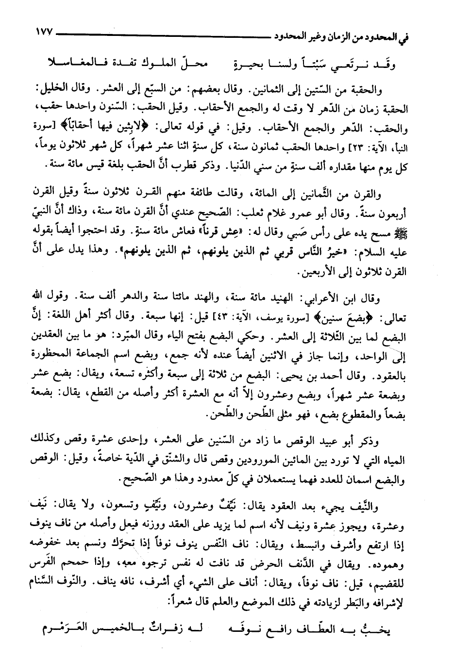 والقرن من الثّمانين إلى المائة، وقالت طائفة منهم القرن ثلاثون سنة وقيل القرن أربعون سنة. وقال أبو عمرو غلام ثعلب: الصّحيح عندي أنّ القرن مائة سنة، وذاك أنّ النبيّ صلى الله عليه وسلم مسح يده على رأس صبي وقال له: «عش قرنا» فعاش مائة سنة. وقد احتجوا أيضا بقوله عليه السلام: «خير النّاس قربي ثم الذين يلونهم، ثم الذين يلونهم» . وهذا يدل على أنّ القرن ثلاثون إلى الأربعين.