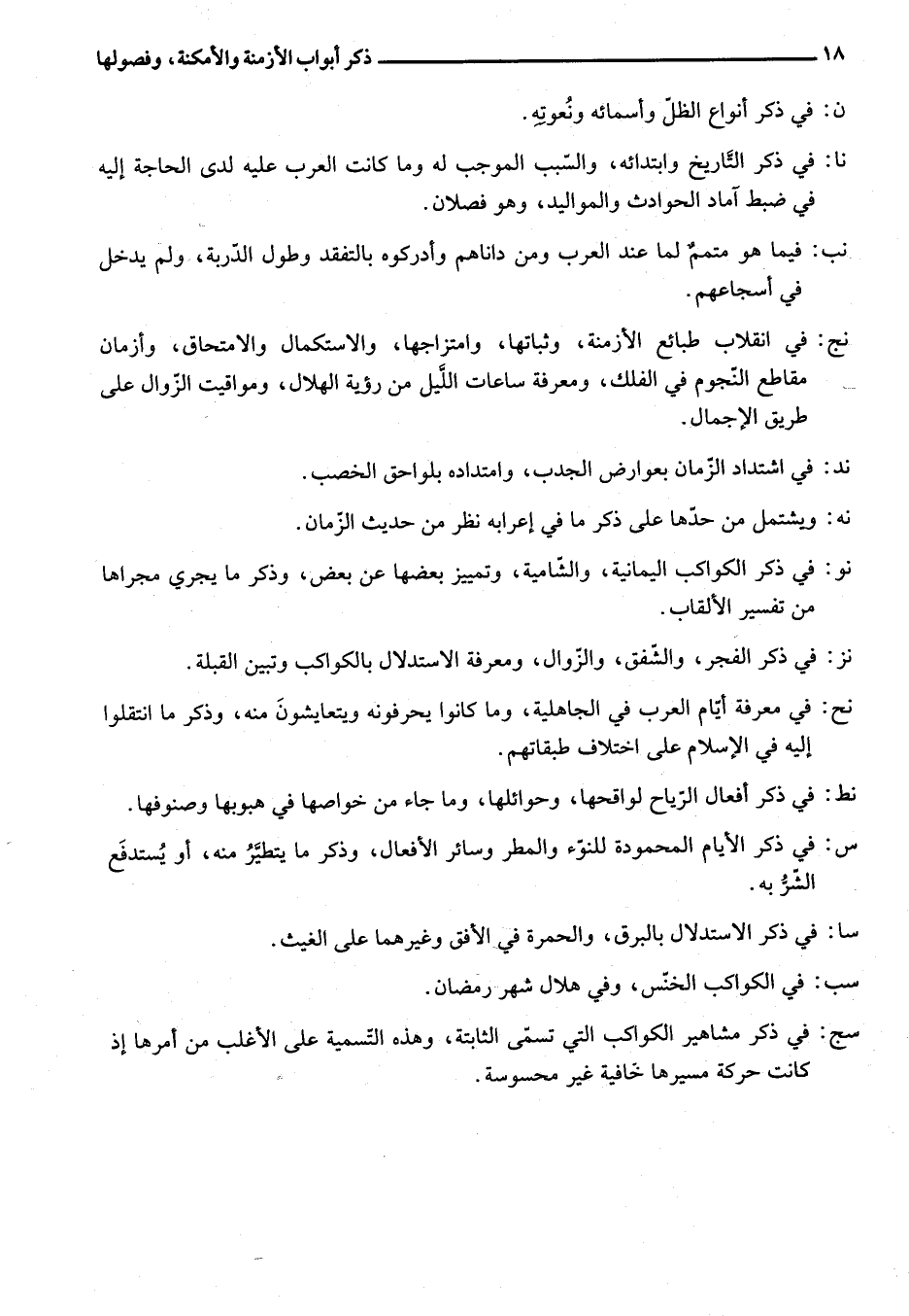 نج: في انقلاب طبائع الأزمنة، وثباتها، وامتزاجها، والاستكمال والامتحاق، وأزمان مقاطع النّجوم في الفلك، ومعرفة ساعات اللّيل من رؤية الهلال، ومواقيت الزّوال على طريق الإجمال.
