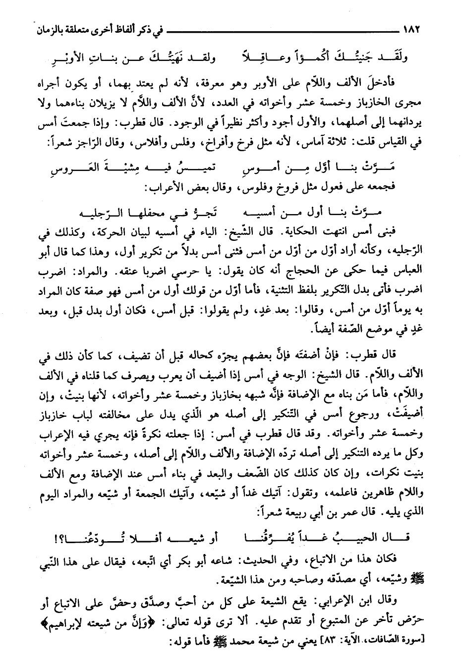 قال قطرب: فإن أضفته فإنّ بعضهم يجرّه كحاله قبل أن تضيف، كما كأن ذلك في الألف واللّام. قال الشيخ: الوجه في أمس إذا أضيف أن يعرب ويصرف كما قلناه في الألف واللّام، فأما من بناه مع الإضافة فإنّه شبهه بخازباز وخمسة عشر وأخواته، لأنها بنيت، وإن أضيفت، ورجوع أمس في التّنكير إلى أصله هو الّذي يدل على مخالفته لباب خازباز وخمسة عشر وأخواته. وقد قال قطرب في أمس: إذا جعلته نكرة فإنه يجري فيه الإعراب وكل ما يرده التنكير إلى أصله تردّه الإضافة والألف واللّام إلى أصله، وخمسة عشر وأخواته بنيت نكرات، وإن كان كذلك كان الضّعف والبعد في بناء أمس عند الإضافة ومع الألف واللام ظاهرين فاعلمه، وتقول: آتيك غدا أو شيّعه، وآتيك الجمعة أو شيّعه والمراد اليوم الذي يليه. قال عمر بن أبي ربيعة شعرا: