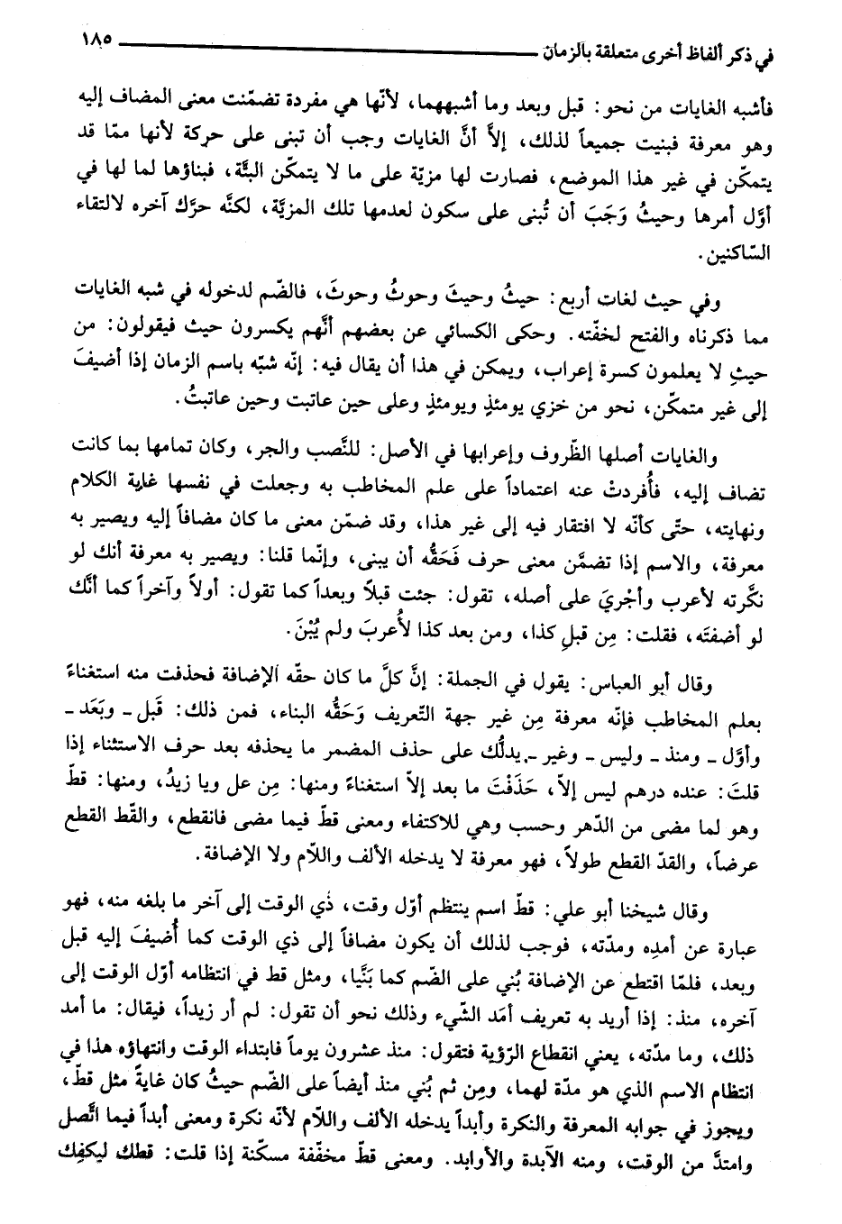 وقال أبو العباس: يقول في الجملة: إنّ كلّ ما كان حقّه الإضافة فحذفت منه استغناء بعلم المخاطب فإنّه معرفة من غير جهة التّعريف وحقّه البناء، فمن ذلك: قبل- وبعد- وأوّل- ومنذ- وليس- وغير- يدلّك على حذف المضمر ما يحذفه بعد حرف الاستثناء إذا قلت: عنده درهم ليس إلّا، حذفت ما بعد إلّا استغناء ومنها: من عل ويا زيد، ومنها: قطّ وهو لما مضى من الدّهر وحسب وهي للاكتفاء ومعنى قطّ فيما مضى فانقطع، والقطّ القطع عرضا، والقدّ القطع طولا، فهو معرفة لا يدخله الألف واللّام ولا الإضافة.