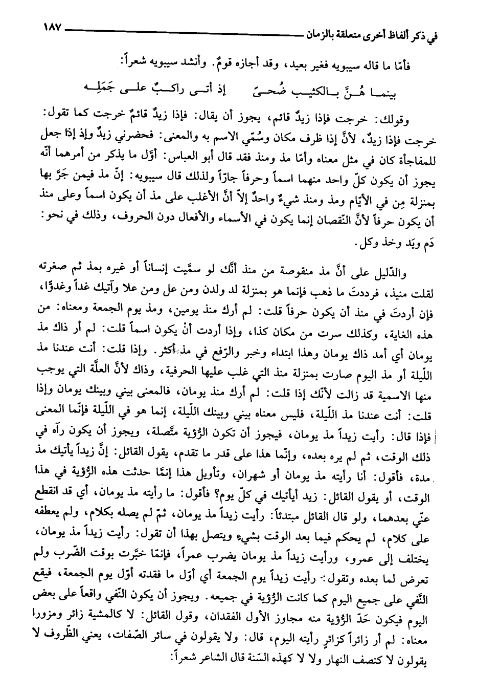 والدّليل على أنّ مذ منقوصة من منذ أنّك لو سمّيت إنسانا أو غيره بمذ ثم صغرته لقلت منيذ، فرددت ما ذهب فإنما هو بمنزلة لد ولدن ومن عل ومن علا وآتيك غدا وغدوّا، فإن أردت في منذ أن يكون حرفا قلت: لم أرك منذ يومين، ومذ يوم الجمعة ومعناه: من هذه الغاية، وكذلك سرت من مكان كذا، وإذا أردت أن يكون اسما قلت: لم أر ذاك مذ يومان أي أمد ذاك يومان وهذا ابتداء وخبر والرّفع في مذ أكثر. وإذا قلت: أنت عندنا مذ اللّيلة أو مذ اليوم صارت بمنزلة منذ التي غلب عليها الحرفية، وذاك لأنّ العلّة التي يوجب منها الاسمية قد زالت لأنّك إذا قلت: لم أرك منذ يومان، فالمعنى بيني وبينك يومان وإذا قلت: أنت عندنا مذ اللّيلة، فليس معناه بيني وبينك اللّيلة، إنما هو في اللّيلة فإنّما المعنى فإذا قال: رأيت زيدا مذ يومان، فيجوز أن تكون الرّؤية متّصلة، ويجوز أن يكون رآه في ذلك الوقت، ثم لم يره بعده، وإنّما هذا على قدر ما تقدم، يقول القائل: إنّ زيدا يأتيك مذ مدة، فأقول: أنا رأيته مذ يومان أو شهران، وتأويل هذا إنّما حدثت هذه الرّؤية في هذا الوقت، أو يقول القائل: زيد أيأتيك في كلّ يوم؟ فأقول: ما رأيته مذ يومان، أي قد انقطع عنّي بعدهما، ولو قال القائل مبتدئا: رأيت زيدا مذ يومان، ثمّ لم يصله بكلام، ولم يعطفه على كلام، لم يحكم فيما بعد الوقت بشيء ويتصل بهذا أن تقول: رأيت زيدا مذ يومان، يختلف إلى عمرو، ورأيت زيدا مذ يومان يضرب عمرا، فإنّما خبّرت بوقت الضّرب ولم تعرض لما بعده وتقول: رأيت زيدا يوم الجمعة أي أوّل ما فقدته أوّل يوم الجمعة، فيقع النّفي على جميع اليوم كما كانت الرّؤية في جميعه. ويجوز أن يكون النّفي واقعا على بعض اليوم فيكون حدّ الرّؤية منه مجاوز الأول الفقدان، وقول القائل: لا كالمشية زائر ومزورا معناه: لم أر زائرا كزائر رأيته اليوم، قال: ولا يقولون في سائر الصّفات، يعني الظّروف لا يقولون لا كنصف النهار ولا لا كهذه السّنة قال الشاعر شعرا: