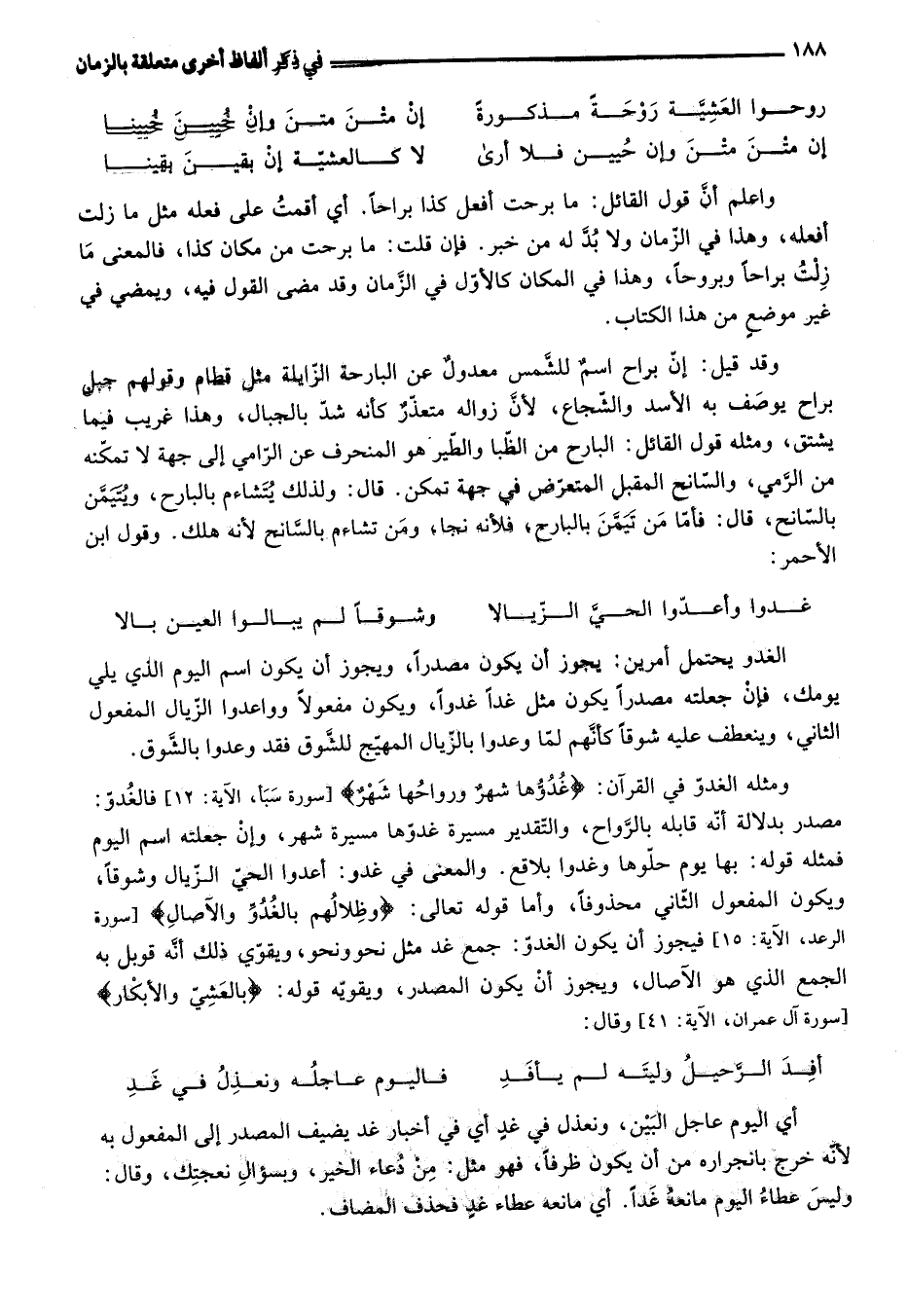 واعلم أنّ قول القائل: ما برحت أفعل كذا براحا. أي أقمت على فعله مثل ما زلت أفعله، وهذا في الزّمان ولا بدّ له من خبر. فإن قلت: ما برحت من مكان كذا، فالمعنى ما زلت براحا وبروحا، وهذا في المكان كالأوّل في الزّمان وقد مضى القول فيه، ويمضي في غير موضع من هذا الكتاب.