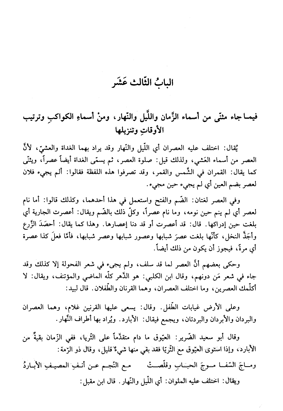 الباب الثّالث عشر فيما جاء مثنّى من أسماء الزّمان واللّيل والنّهار، ومن أسماء الكواكب وترتيب الأوقات وتنزيلها