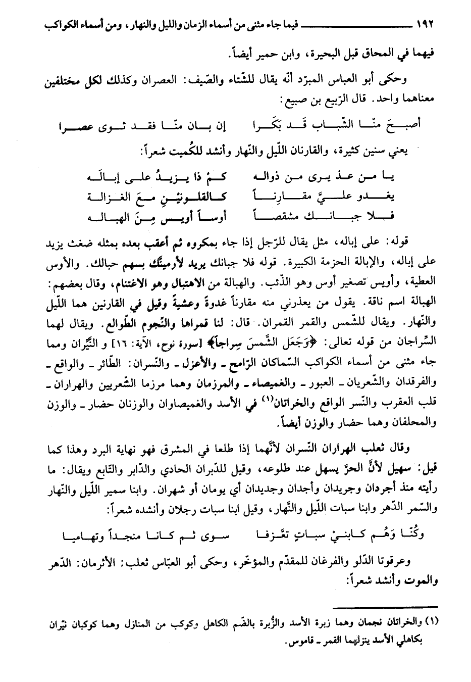 [سورة نوح، الآية: 16] والنّيران ومما جاء مثنى من أسماء الكواكب السّماكان الرّامح- والأعزل- والنّسران: الطّائر- والواقع- والفرقدان والشّعريان- العبور- والغميصاء- والمرزمان وهما مرزما الشّعريين والهراران- قلب العقرب والنّسر الواقع والخراتان «1» في الأسد والغميصاوان والوزنان حضار- والوزن والمحلفان وهما حضار والوزن أيضا.