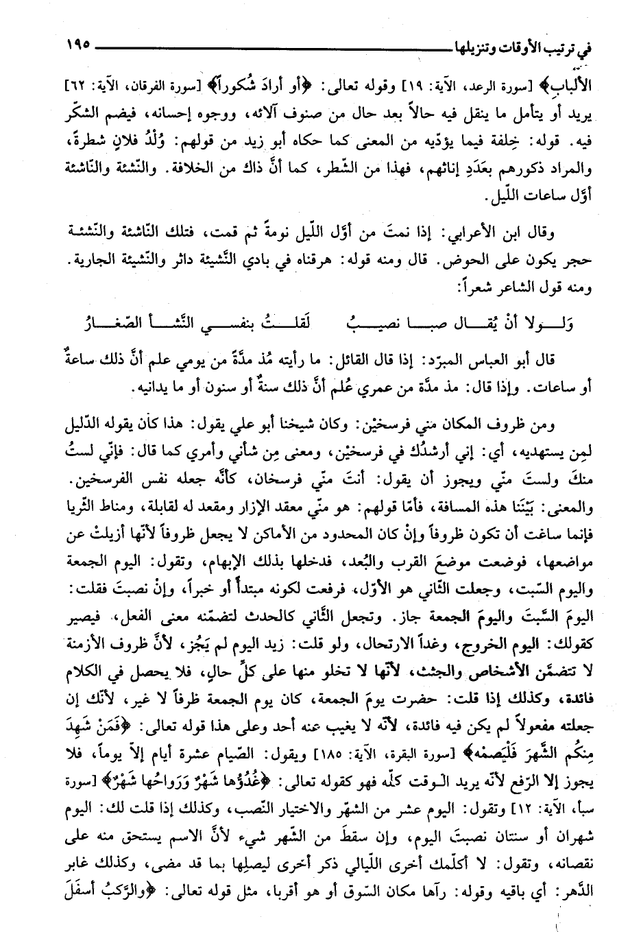 [سورة سبأ، الآية: 12] وتقول: اليوم عشر من الشّهر والاختيار النّصب، وكذلك إذا قلت لك: اليوم شهران أو سنتان نصبت اليوم، وإن سقط من الشّهر شيء لأنّ الاسم يستحق منه على نقصانه، وتقول: لا أكلّمك أخرى اللّيالي ذكر أخرى ليصلها بما قد مضى، وكذلك غابر الدّهر: أي باقيه وقوله: رآها مكان السّوق أو هو أقربا، مثل قوله تعالى: