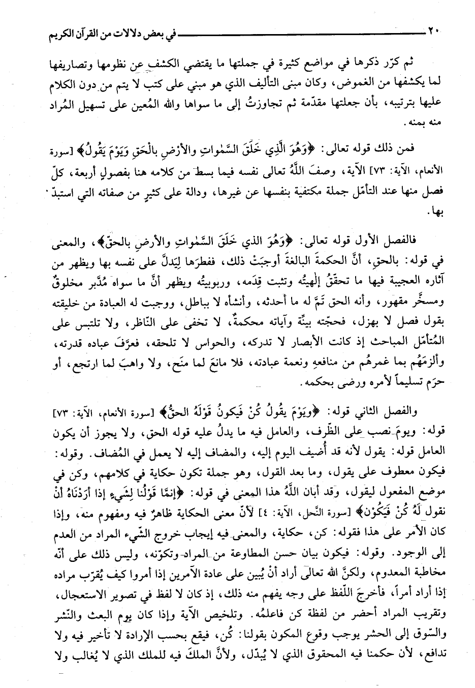 فمن ذلك قوله تعالى: وَهُوَ الَّذِي خَلَقَ السَّماواتِ وَالْأَرْضَ بِالْحَقِّ وَيَوْمَ يَقُولُ