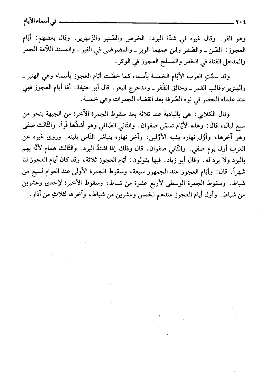 وقال الكلابي: هي بالبادية عند ثلاثة بعد سقوط الجمرة الآخرة من الجبهة بنحو من سبع ليال، قال: وهذه الأيّام تسمّى صفوان. والثّاني الصّافي وهو أشدّها قرا، والثّالث صفى وهو آخرها، وأوّل نهاره يشبه الأوّلين، وآخر نهاره يتباشر النّاس بلينه. وروى غيره عن العرب أول يوم صفي. والثّاني صفوان. قال وذلك إذا اشتدّ البرد. والثّالث همام لأنّه يهم بالبرد ولا برد له. وقال أبو زياد: فيها يقولون: أيّام العجوز ثلاثة، وقد كان أيام العجوز لنا شهرا. قال: وأيّام العجوز عند الجمهور سبعة، وسقوط الجمرة الأولى عند العوام لسبع من شباط. وسقوط الجمرة الوسطى لأربع عشرة من شباط، وسقوط الأخيرة لإحدى وعشرين من شباط. وأول أيام العجوز عندهم لخمس وعشرين من شباط، وآخرها لثلاث من آذار.