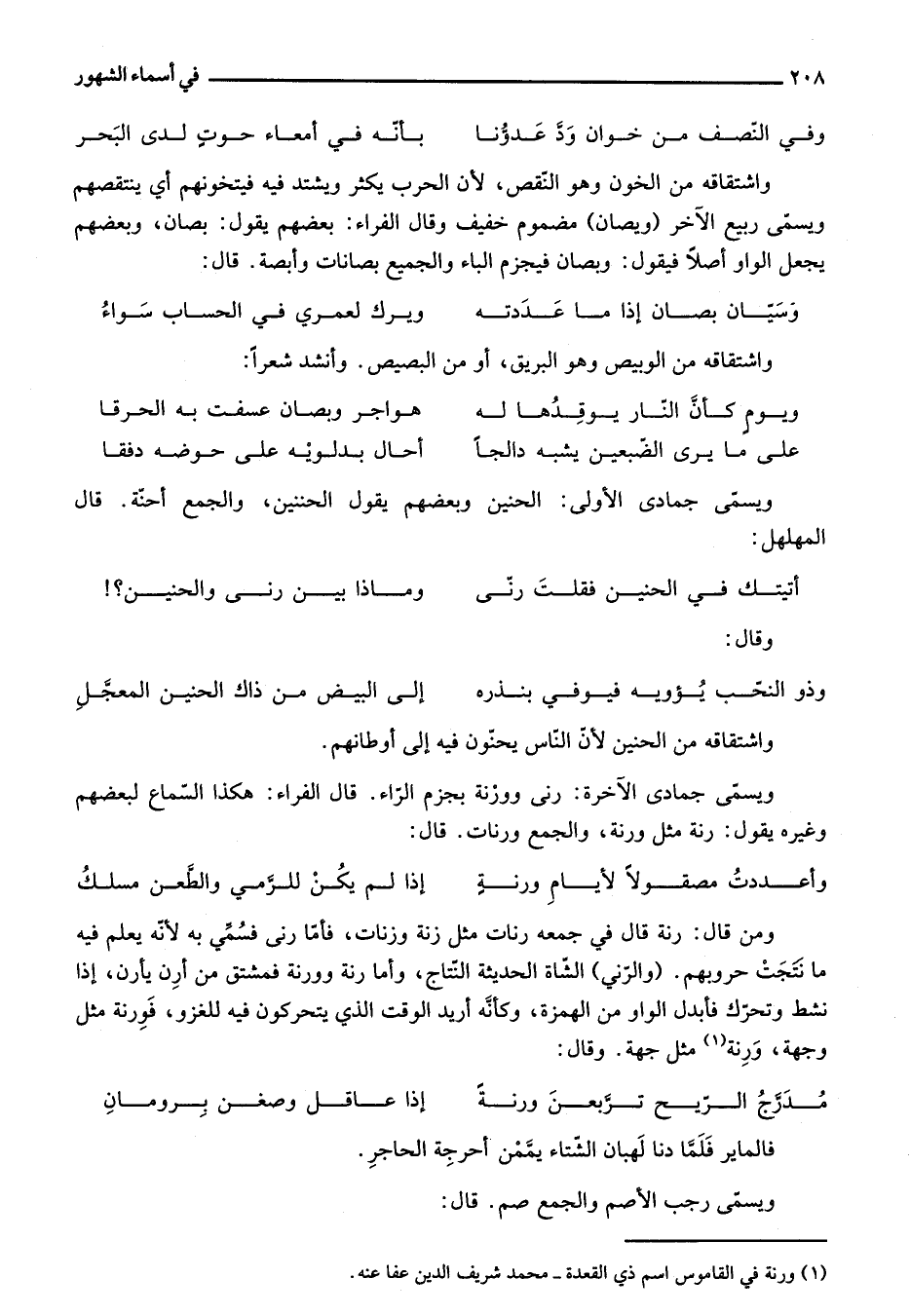 ومن قال: رنة قال في جمعه رنات مثل زنة وزنات، فأمّا رنى فسمّي به لأنّه يعلم فيه ما نتجت حروبهم. (والرّني) الشّاة الحديثة النّتاج، وأما رنة وورنة فمشتق من أرن يأرن، إذا نشط وتحرّك فأبدل الواو من الهمزة، وكأنّه أريد الوقت الذي يتحركون فيه للغزو، فورنة مثل وجهة، ورنة «1» مثل جهة. وقال: