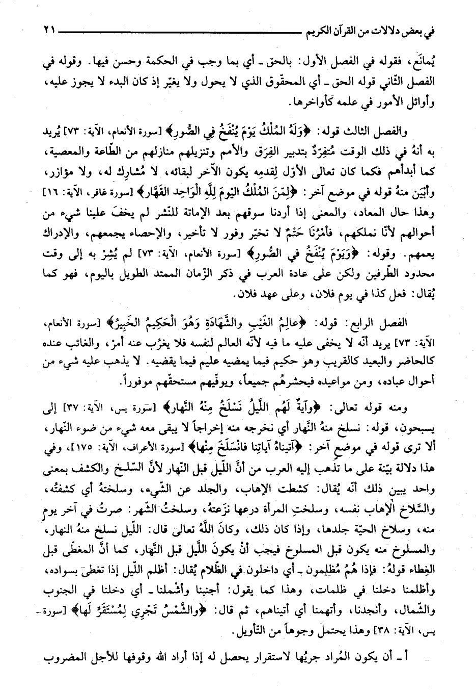 [سورة الأنعام، الآية: 73] لم يشر به إلى وقت محدود الطّرفين ولكن على عادة العرب في ذكر الزّمان الممتد الطويل باليوم، فهو كما يقال: فعل كذا في يوم فلان، وعلى عهد فلان.