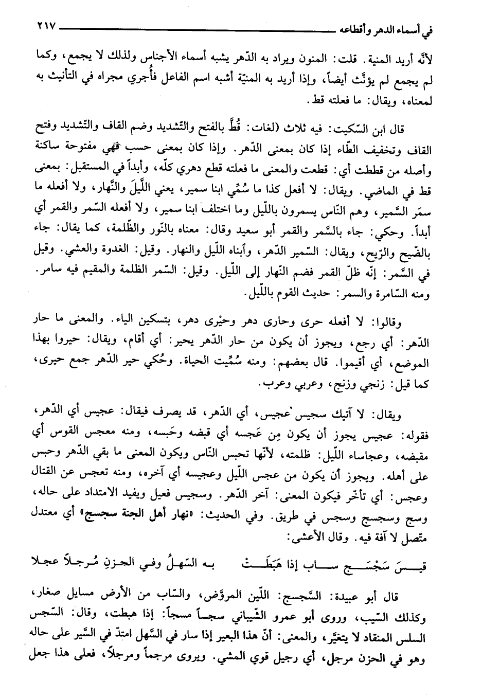 قال ابن السّكيت: فيه ثلاث (لغات: قطّ بالفتح والتّشديد وضم القاف والتّشديد وفتح القاف وتخفيف الطّاء إذا كان بمعنى الدّهر. وإذا كان بمعنى حسب فهي مفتوحة ساكنة وأصله من قططت أي: قطعت والمعنى ما فعلته قطع دهري كلّه، وأبدا في المستقبل: بمعنى قط في الماضي. ويقال: لا أفعل كذا ما سمّي ابنا سمير، يعني اللّيل والنّهار، ولا أفعله ما سمر السّمير، وهم النّاس يسمرون باللّيل وما اختلف ابنا سمير، ولا أفعله السّمر والقمر أي أبدا. وحكي: جاء بالسّمر والقمر أبو سعيد وقال: معناه بالنّور والظّلمة، كما يقال: جاء بالضّيح والرّيح، ويقال: السّمير الدّهر، وابناه اللّيل والنهار. وقيل: الغدوة والعشي. وقيل في السّمر: إنّه ظلّ القمر فضم النّهار إلى اللّيل. وقيل: السّمر الظلمة والمقيم فيه سامر.