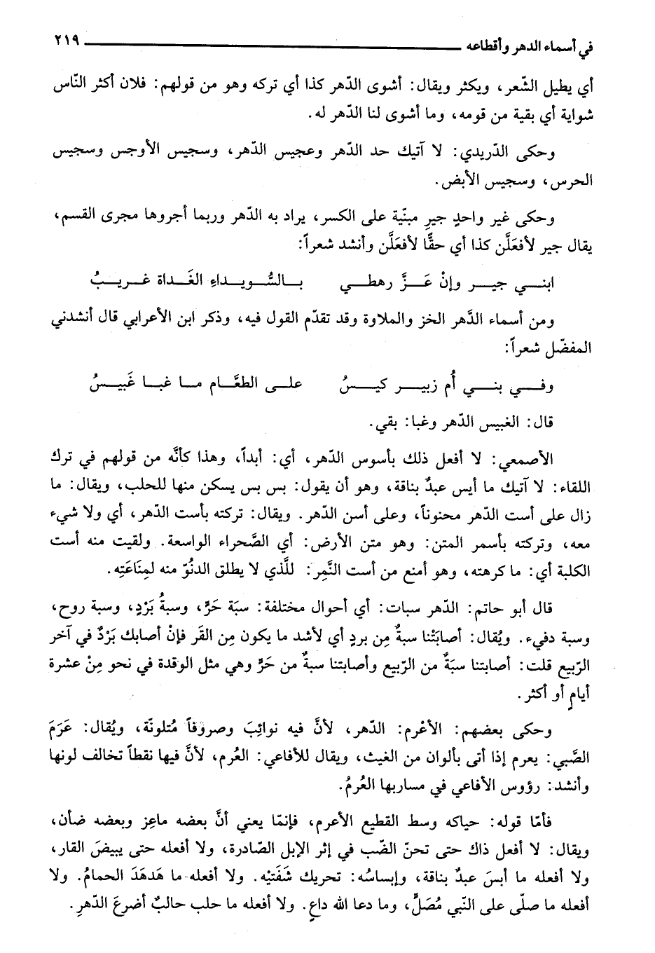 فأمّا قوله: حياكه وسط القطيع الأعرم، فإنمّا يعني أنّ بعضه ما عز وبعضه ضأن، ويقال: لا أفعل ذاك حتى تحنّ الضّب في إثر الإبل الصّادرة، ولا أفعله حتى يبيض القار، ولا أفعله ما أبس عبد بناقة، وإبساسه: تحريك شفتيه. ولا أفعله ما هدهد الحمام. ولا أفعله ما صلّى على النّبي مصلّ، وما دعا الله داع. ولا أفعله ما حلب حالب أضرع الدّهر.