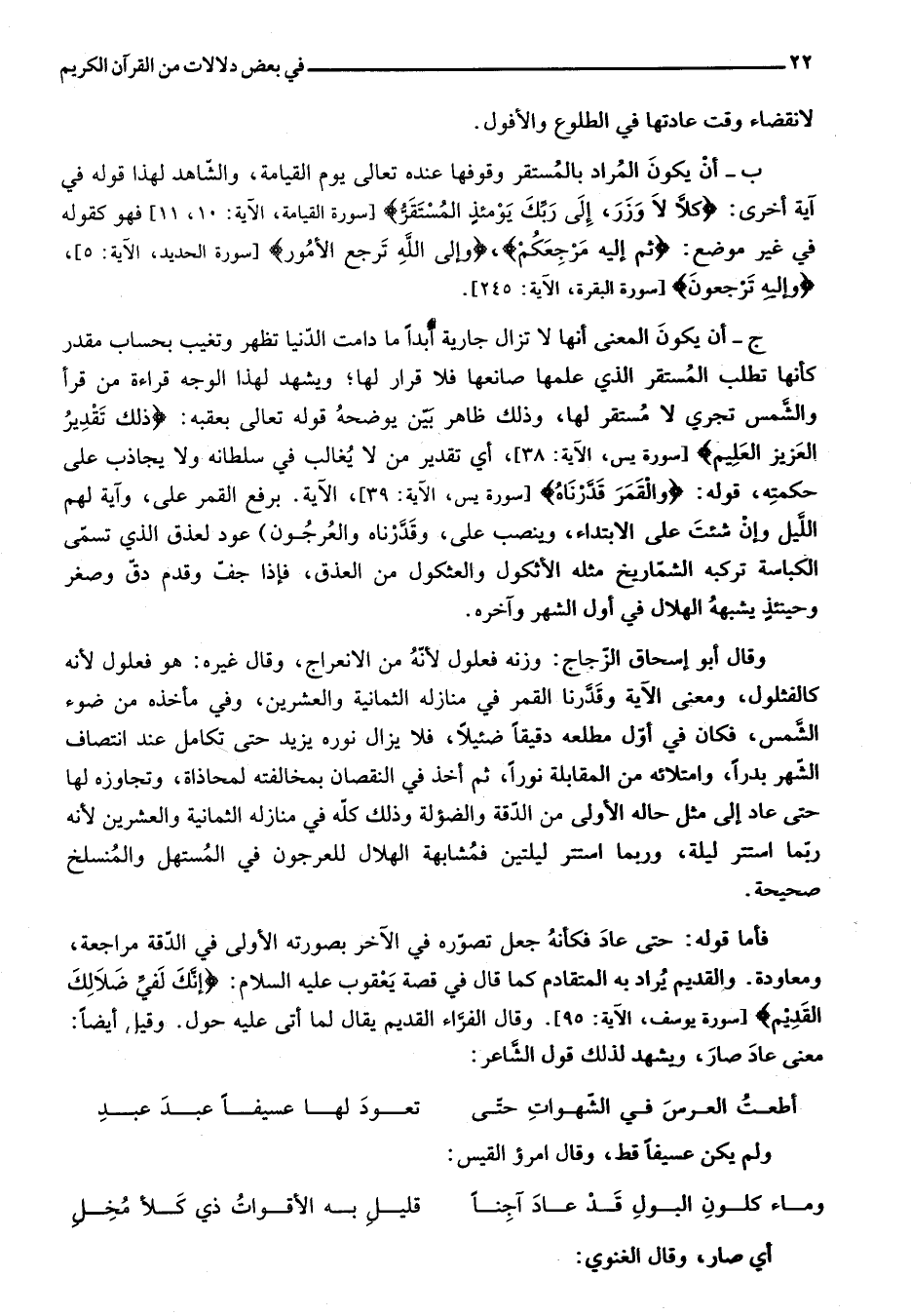 ج- أن يكون المعنى أنها لا تزال جارية أبدا ما دامت الدّنيا تظهر وتغيب بحساب مقدر كأنها تطلب المستقر الذي علمها صانعها فلا قرار لها؛ ويشهد لهذا الوجه قراءة من قرأ والشّمس تجري لا مستقر لها، وذلك ظاهر بيّن يوضحه قوله تعالى بعقبه: ذلِكَ تَقْدِيرُ الْعَزِيزِ الْعَلِيمِ*