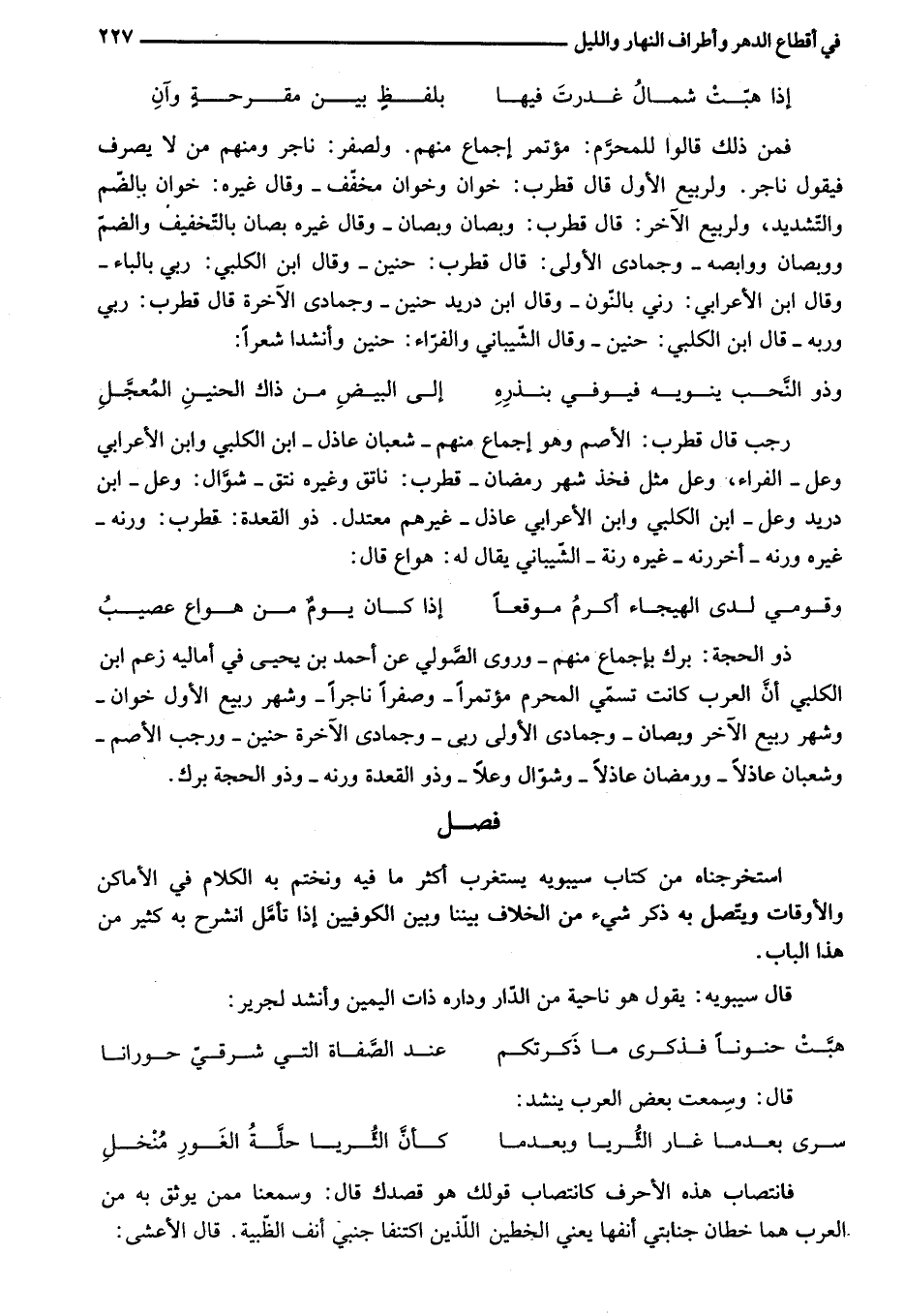 فمن ذلك قالوا للمحرّم: مؤتمر إجماع منهم. ولصفر: ناجر ومنهم من لا يصرف فيقول ناجر. ولربيع الأول قال قطرب: خوان وخوان مخفّف- وقال غيره: خوان بالضّم والتّشديد، ولربيع الآخر: قال قطرب: وبصان وبصان- وقال غيره بصان بالتّخفيف والضمّ ووبصان ووابصه- وجمادى الأولى: قال قطرب: حنين- وقال ابن الكلبي: ربي بالباء- وقال ابن الأعرابي: رني بالنّون- وقال ابن دريد حنين- وجمادى الآخرة قال قطرب: ربي وربه- قال ابن الكلبي: حنين- وقال الشّيباني والفرّاء: حنين وأنشدا شعرا: