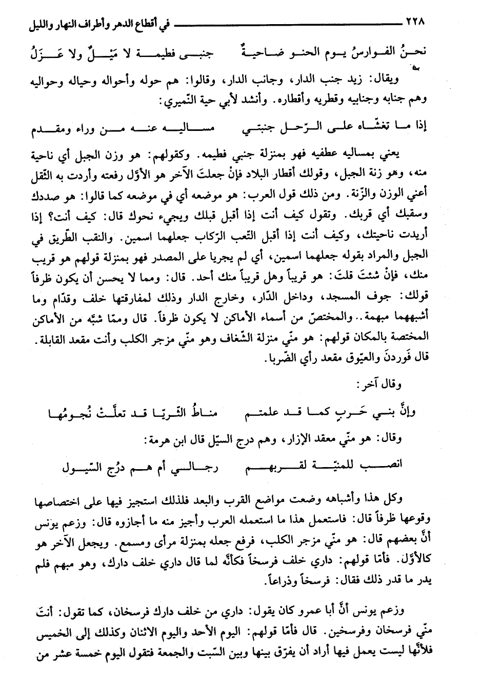 وزعم يونس أنّ أبا عمرو كان يقول: داري من خلف دارك فرسخان، كما تقول: أنت منّي فرسخان وفرسخين. قال فأمّا قولهم: اليوم الأحد واليوم الاثنان وكذلك إلى الخميس فلأنّها ليست يعمل فيها أراد أن يفرّق بينها وبين السّبت والجمعة فتقول اليوم خمسة عشر من