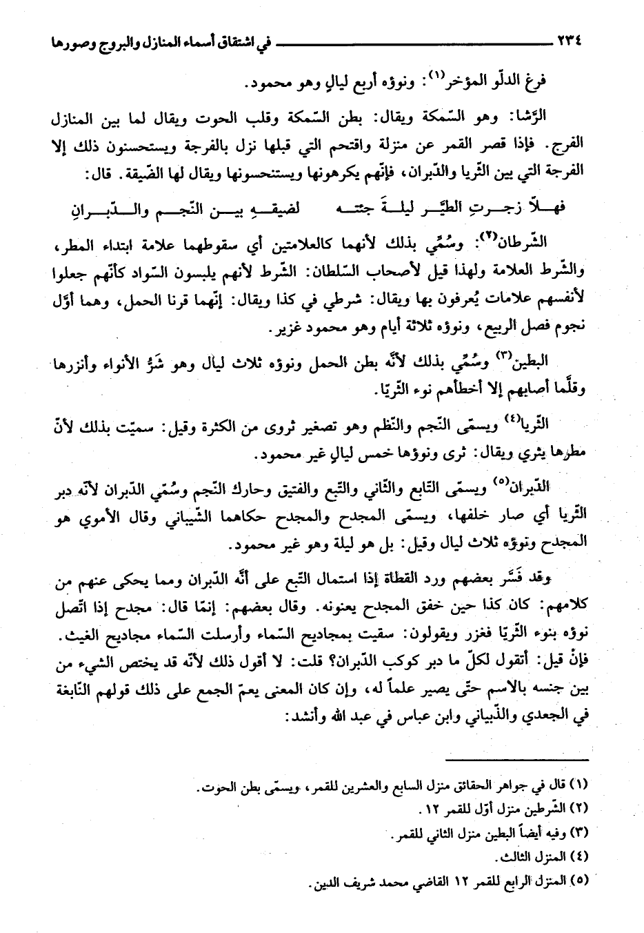 الثّريا «4» ويسمّى النّجم والنّظم وهو تصغير ثروى من الكثرة وقيل: سميّت بذلك لأنّ مطرها يثري ويقال: ثرى ونوؤها خمس ليال غير محمود.