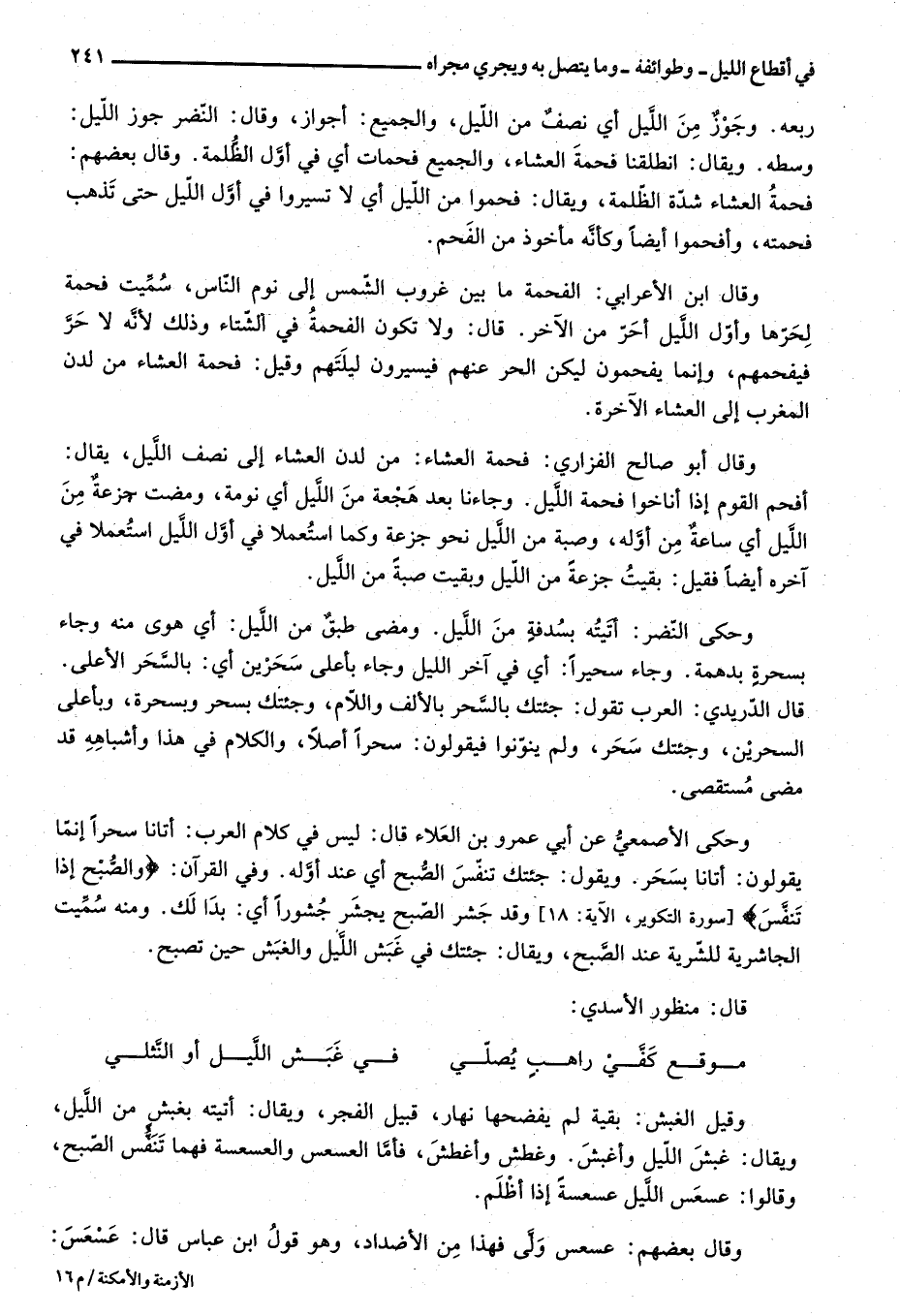 وحكى النّضر: أتيته بسدفة من اللّيل. ومضى طبق من اللّيل: أي هوى منه وجاء بسحرة بدهمة. وجاء سحيرا: أي في آخر الليل وجاء بأعلى سحرين أي: بالسّحر الأعلى.