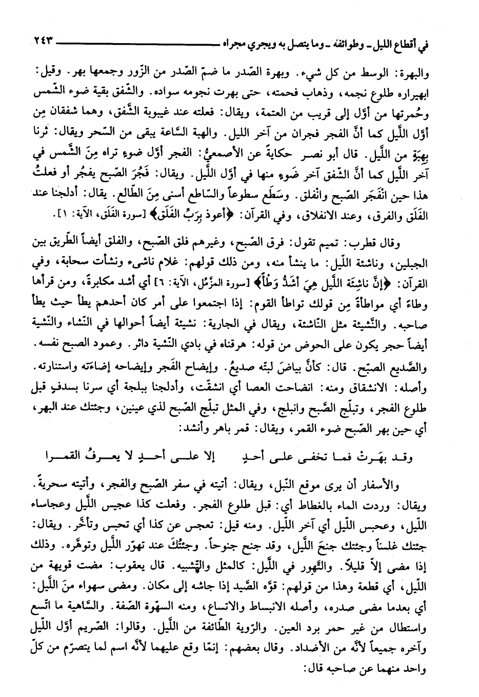 ابهيراره طلوع نجمه، وذهاب فحمته، حتى بهرت نجومه سواده. والشّفق بقية ضوء الشّمس وحمرتها من أوّل إلى قريب من العتمة، ويقال: فعلته عند غيبوبة الشّفق، وهما شفقان من أوّل اللّيل كما أنّ الفجر فجران من آخر الليل. والهبة السّاعة يبقى من السّحر ويقال: ثرنا بهبة من اللّيل. قال أبو نصر حكاية عن الأصمعيّ: الفجر أوّل ضوء تراه من الشّمس في آخر اللّيل كما أنّ الشّفق آخر ضوء منها في أوّل اللّيل. ويقال: فجر الصّبح يفجر أو فعلت هذا حين انفجر الصّبح وانفلق. وسطع سطوعا والسّاطع أسنى من الطّالع. يقال: أدلجنا عند الفلق والفرق، وعند الانفلاق، وفي القرآن: أَعُوذُ بِرَبِّ الْفَلَقِ