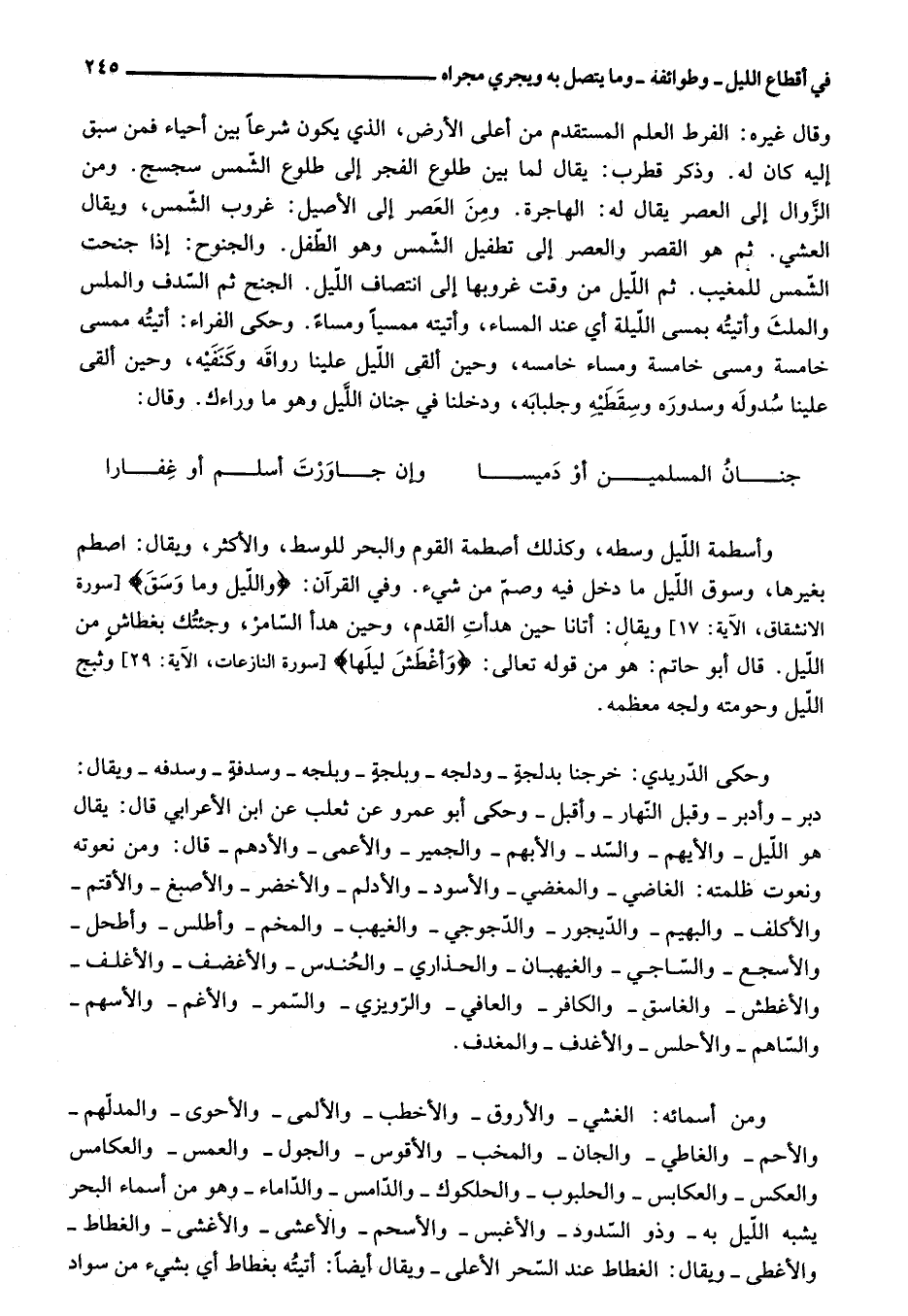 وقال غيره: الفرط العلم المستقدم من أعلى الأرض، الذي يكون شرعا بين أحياء فمن سبق إليه كان له. وذكر قطرب: يقال لما بين طلوع الفجر إلى طلوع الشّمس سجسج. ومن الزّوال إلى العصر يقال له: الهاجرة. ومن العصر إلى الأصيل: غروب الشّمس، ويقال العشي. ثم هو القصر والعصر إلى تطفيل الشّمس وهو الطّفل. والجنوح: إذا جنحت الشّمس للمغيب. ثم اللّيل من وقت غروبها إلى انتصاف اللّيل. الجنح ثم السّدف والملس والملث وأتيته بمسى اللّيلة أي عند المساء، وأتيته ممسيا ومساء. وحكى الفراء: أتيته ممسى خامسة ومسى خامسة ومساء خامسه، وحين ألقى اللّيل علينا رواقه وكنفيه، وحين ألقى علينا سدوله وسدوره وسقطيه وجلبابه، ودخلنا في جنان اللّيل وهو ما وراءك. وقال: