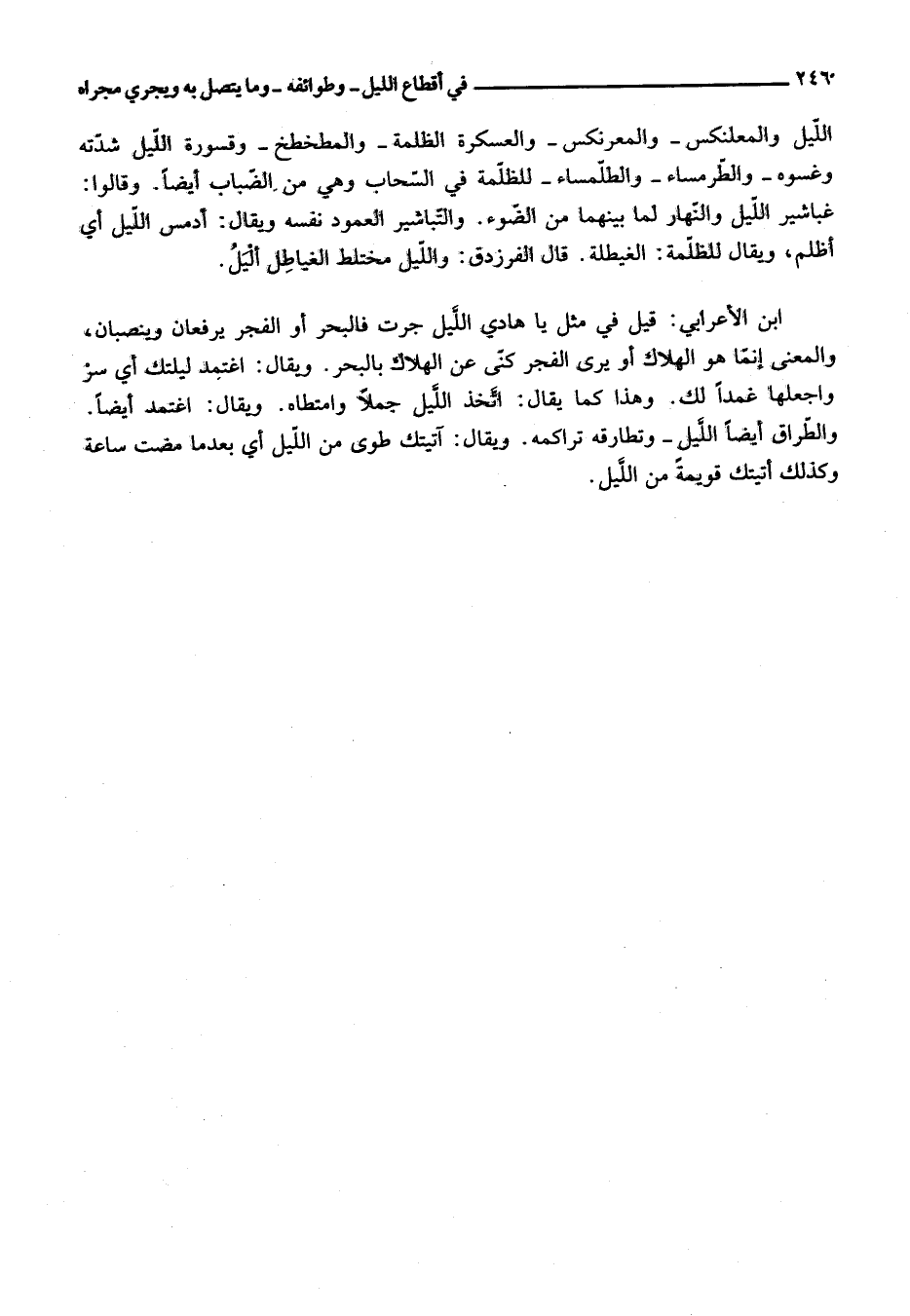 اللّيل والمعلنكس- والمعرنكس- والعسكرة الظلمة- والمطخطخ- وقسورة اللّيل شدّته وغسوه- والطّرمساء- والطّلمساء- للظلّمة في السّحاب وهي من الضّباب أيضا. وقالوا: