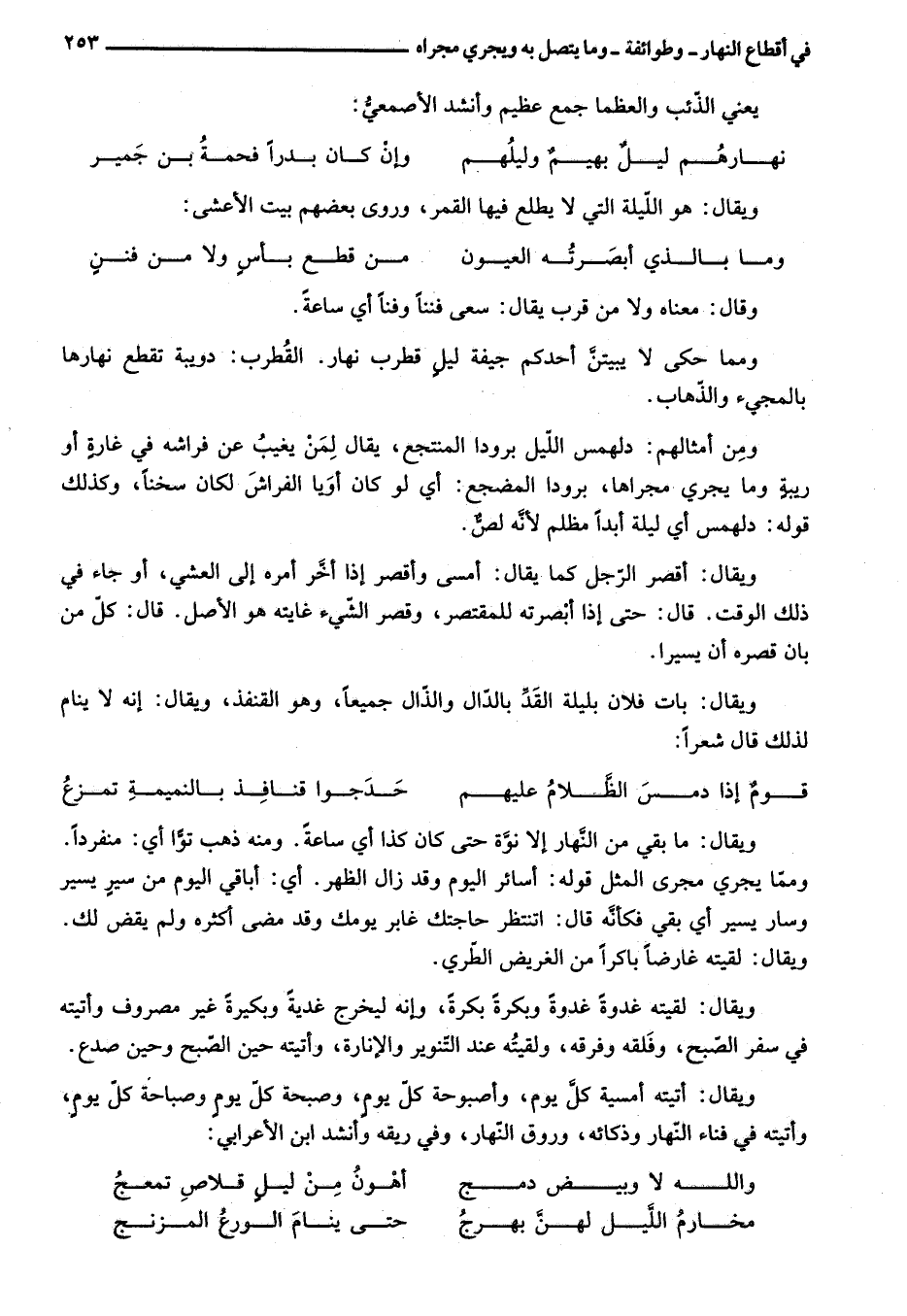 ويقال: أتيته أمسية كلّ يوم، وأصبوحة كلّ يوم، وصبحة كلّ يوم وصباحة كلّ يوم، وأتيته في فناء النّهار وذكائه، وروق النّهار، وفي ريقه وأنشد ابن الأعرابي: