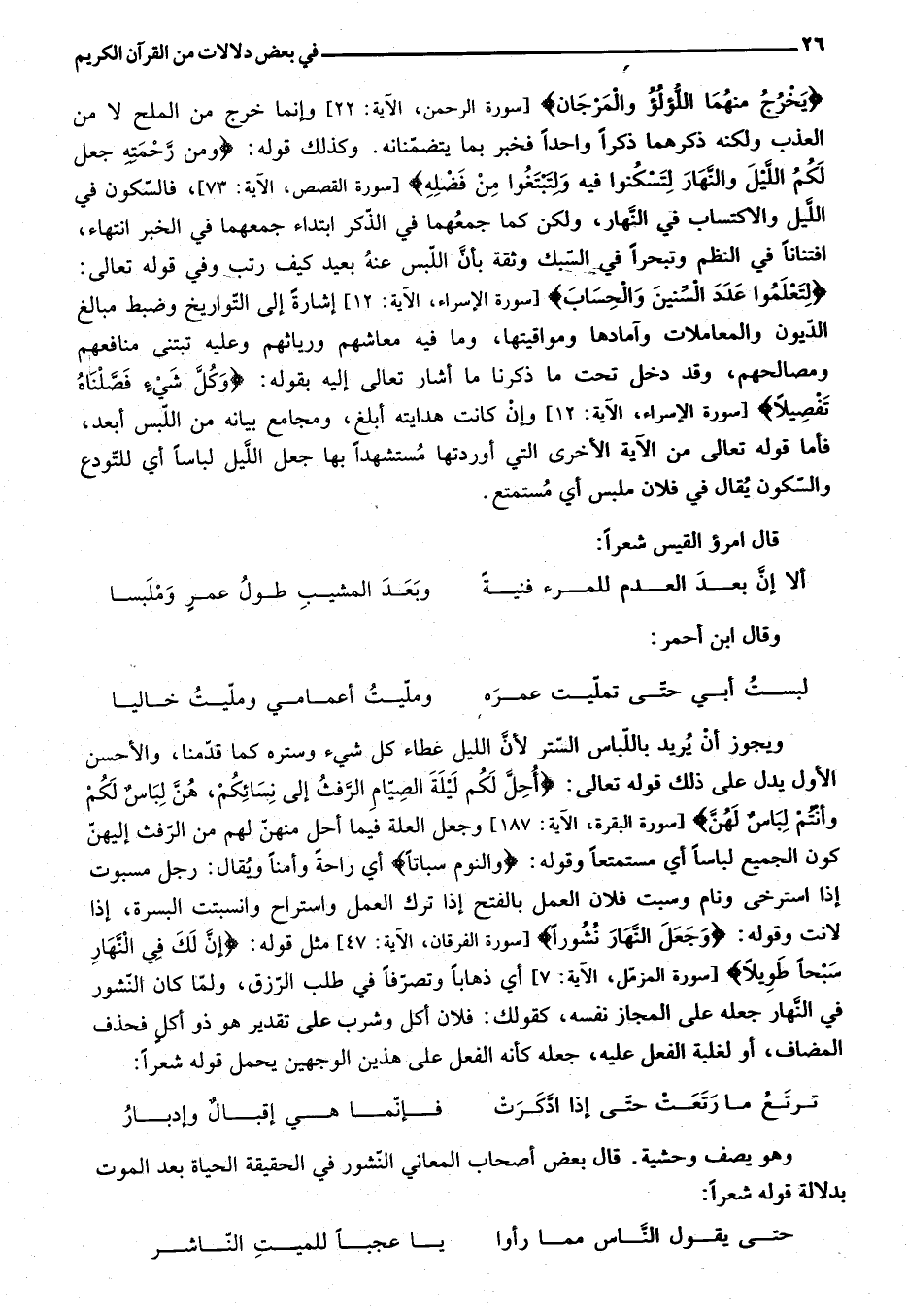 [سورة الرحمن، الآية: 22] وإنما خرج من الملح لا من العذب ولكنه ذكرهما ذكرا واحدا فخبر بما يتضمّنانه. وكذلك قوله: وَمِنْ رَحْمَتِهِ جَعَلَ لَكُمُ اللَّيْلَ وَالنَّهارَ لِتَسْكُنُوا فِيهِ وَلِتَبْتَغُوا مِنْ فَضْلِهِ