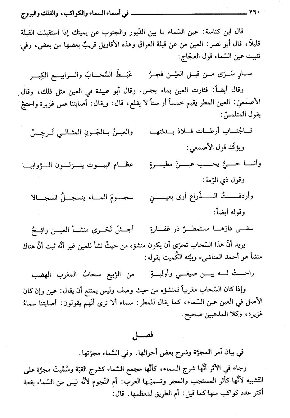 وإذا كان السّحاب مغربيا فمنشؤه من حيث وصف وليس يمتنع أن يقال: عين وإن كان الأصل في العين عين السّماء، كما يقال للمطر: سماء ألا ترى أنّهم يقولون: أصابتنا سماء غزيرة، وكلا المذهبين صحيح.