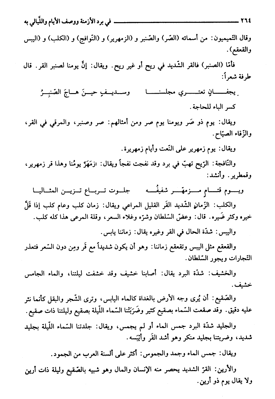 فأمّا (الصنبر) فالقر الشّديد في ريح أو غير ريح. ويقال: إنّ يومنا لصنبر القر. قال طرفة شعرا: