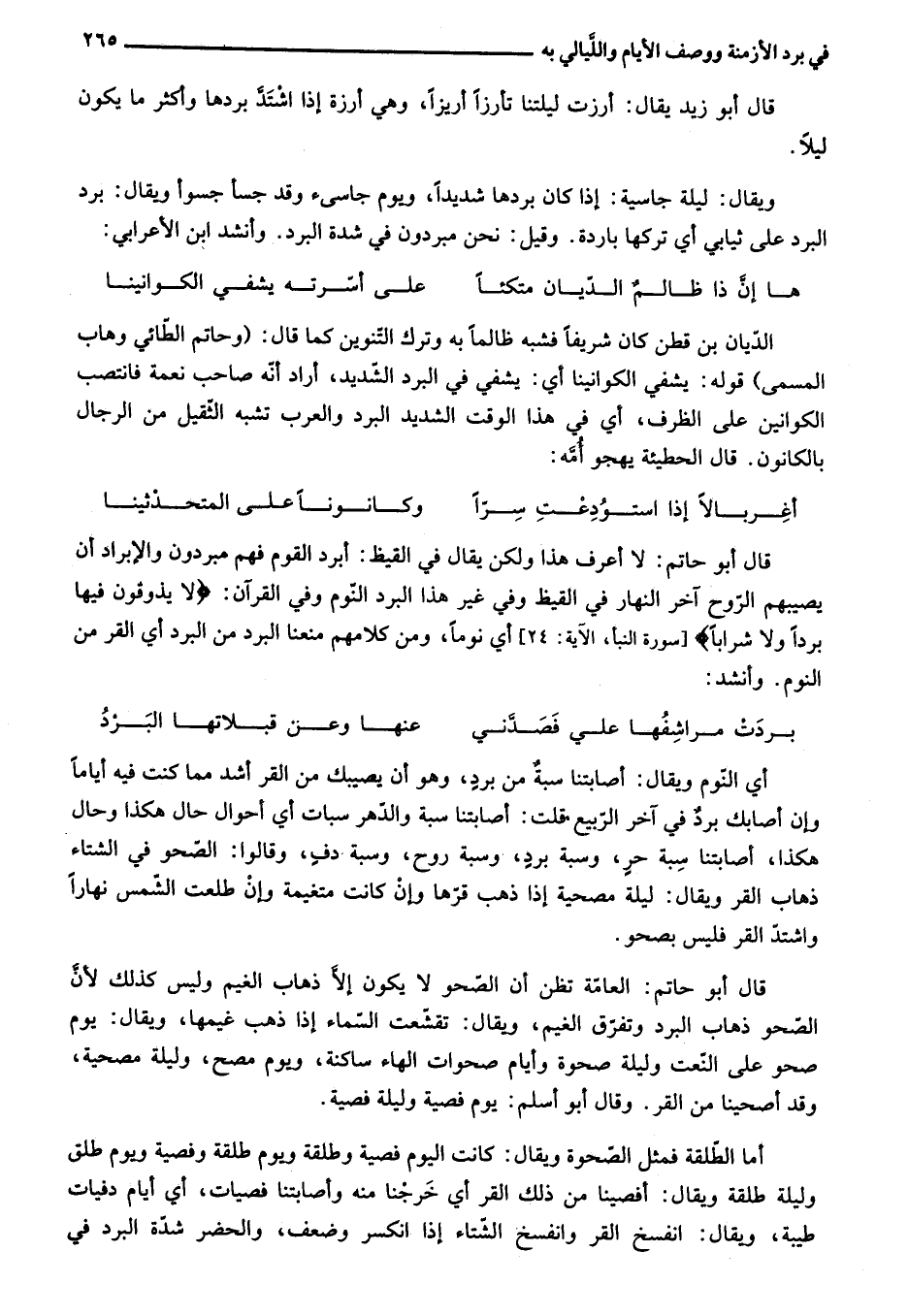 [سورة النبأ، الآية: 24] أي نوما، ومن كلامهم منعنا البرد من البرد أي القر من النوم. وأنشد:
