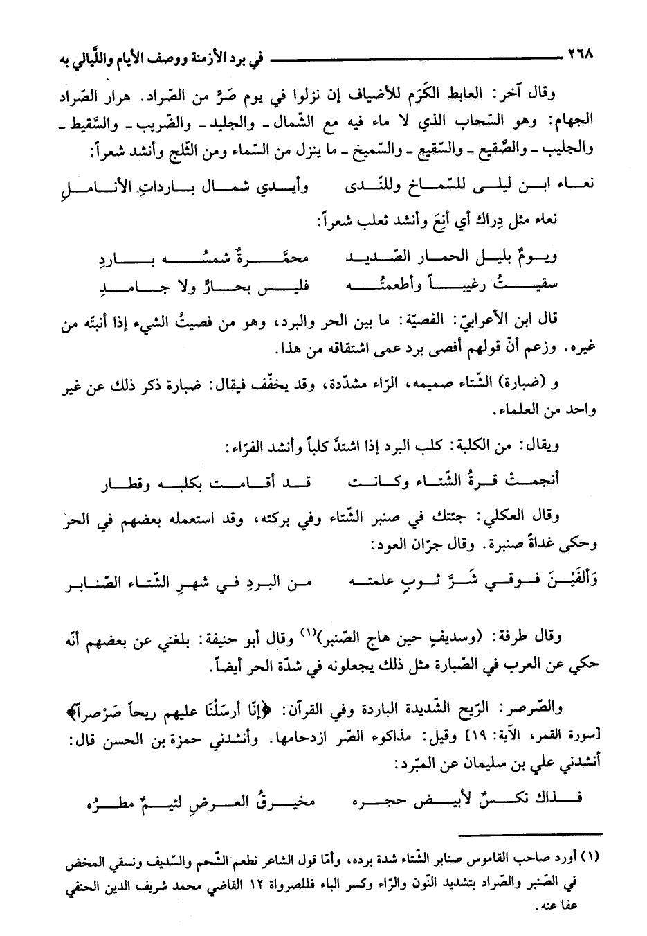 وقال آخر: العابط الكرم للأضياف إن نزلوا في يوم صرّ من الصّراد. هرار الصّراد الجهام: وهو السّحاب الذي لا ماء فيه مع الشّمال- والجليد- والضّريب- والسّقيط- والجليب- والصّقيع- والسّقيع- والسّميخ- ما ينزل من السّماء ومن الثّلج وأنشد شعرا: