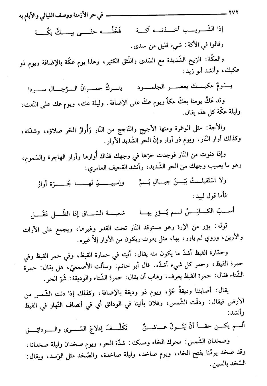 وحمّارة القيظ أشدّ ما يكون منه يقال: أتيته في حمارة القيظ، وفي حمر القيظ وفي حمرة القيظ، وحمر كل شيء أشدّه. قال أبو حاتم: وسألت الأصمعيّ، هل يقال: حمرة الشّتاء فقال: حمرة القيظ يعرف، وهاب أن يقال: حمرة الشّتاء والوديقة: شرّ الحر.