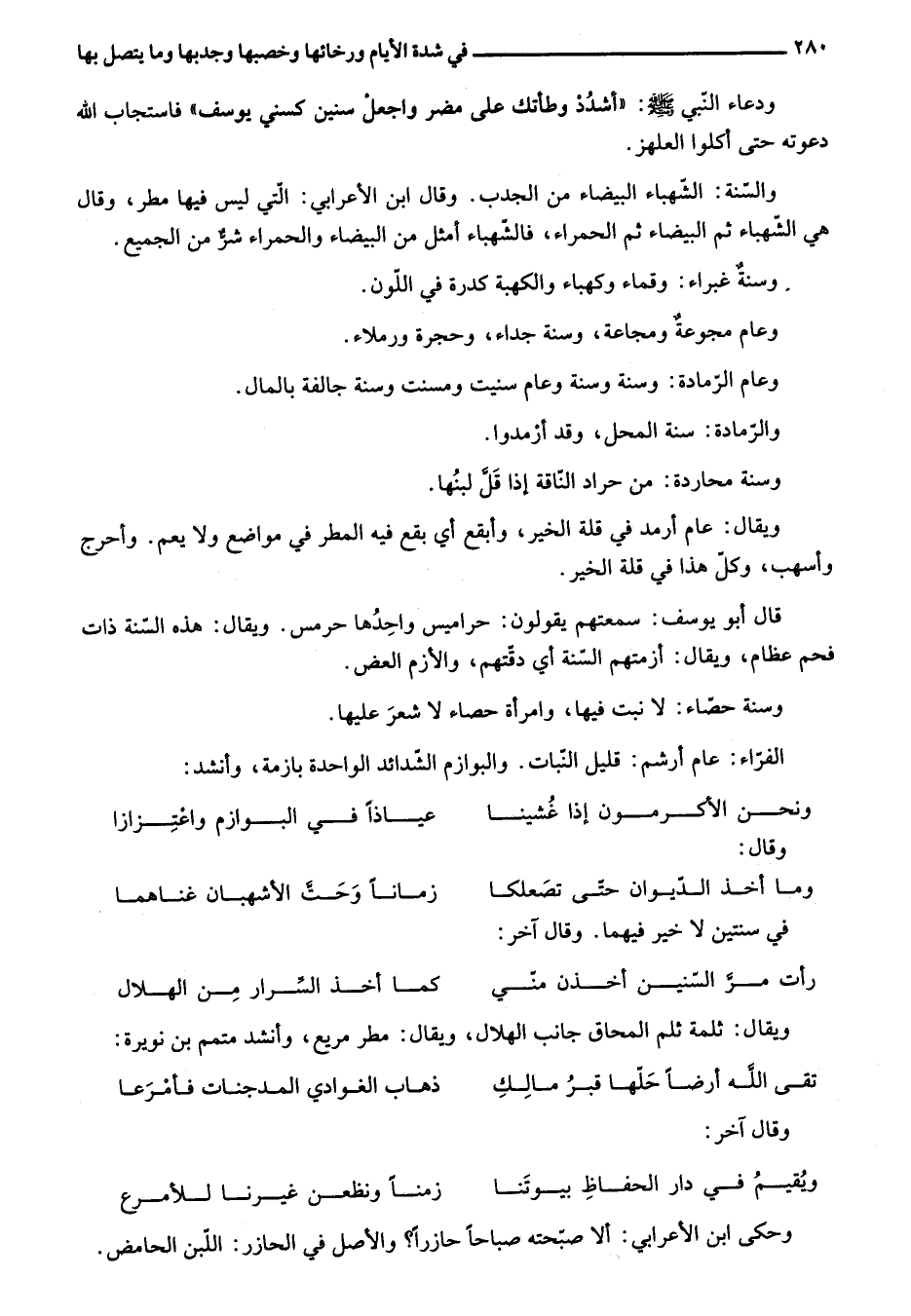 ويقال: عام أرمد في قلة الخير، وأبقع أي بقع فيه المطر في مواضع ولا يعم. وأحرج وأسهب، وكلّ هذا في قلة الخير.