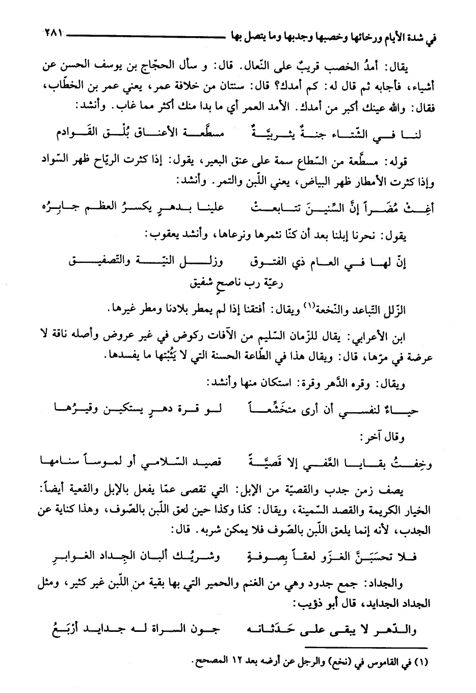 الخيار الكريمة والقصد السّمينة، ويقال: كذا وكذا حين لعق اللّبن بالصّوف، وهذا كناية عن الجدب، لأنه إنما يلعق اللّبن بالصّوف فلا يمكن شربه. قال: