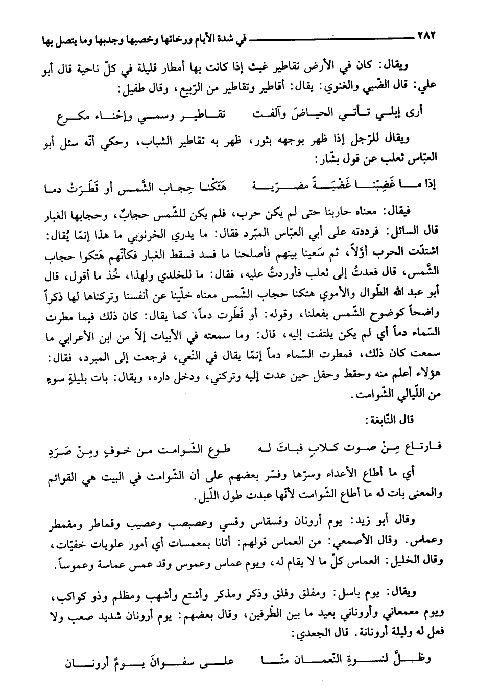 اشتدّت الحرب أوّلا، ثم سعينا بينهم فأصلحنا ما فسد فسقط الغبار فكأنّهم هتكوا حجاب الشّمس، قال فعدت إلى ثعلب فأوردت عليه، فقال: ما للخلدي ولهذا، خذ ما أقول، قال أبو عبد الله الطّوال والأموي هتكنا حجاب الشّمس معناه خلّينا عن أنفسنا وتركناها لها ذكرا واضحا كوضوح الشّمس بفعلنا، وقوله: أو قطرت دما، كما يقال: كان ذلك فيما مطرت السّماء دما أي لم يكن يلتفت إليه، قال: وما سمعته في الأبيات إلّا من ابن الأعرابي ما سمعت كان ذلك، فمطرت السّماء دما إنمّا يقال في النّعي، فرجعت إلى المبرد، فقال: