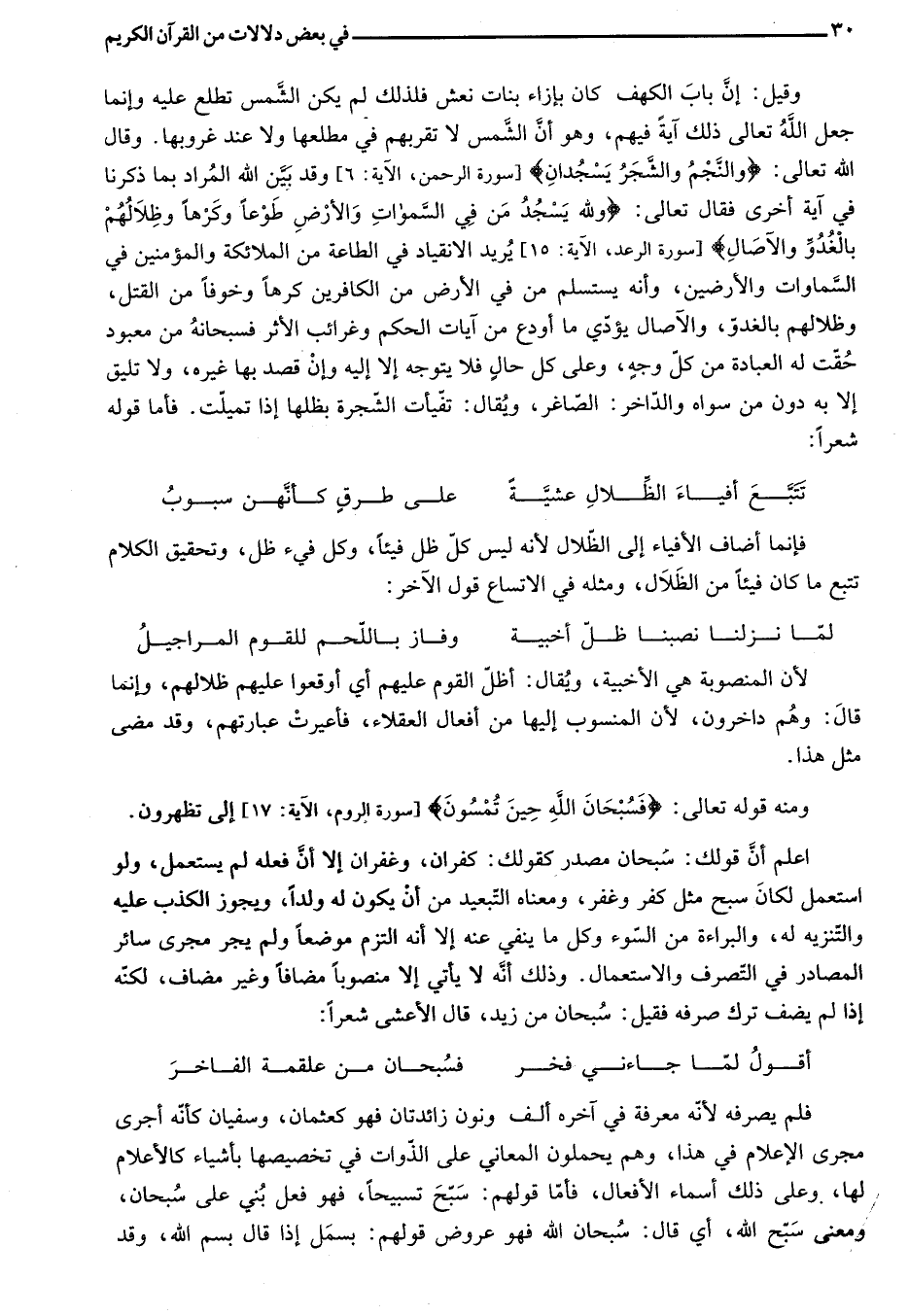 [سورة الرعد، الآية: 15] يريد الانقياد في الطاعة من الملائكة والمؤمنين في السّماوات والأرضين، وأنه يستسلم من في الأرض من الكافرين كرها وخوفا من القتل، وظلالهم بالغدوّ، والآصال يؤدّي ما أودع من آيات الحكم وغرائب الأثر فسبحانه من معبود حقّت له العبادة من كلّ وجه، وعلى كل حال فلا يتوجه إلا إليه وإن قصد بها غيره، ولا تليق إلا به دون من سواه والدّاخر: الصّاغر، ويقال: تفيّأت الشّجرة بظلها إذا تميلّت. فأما قوله شعرا: