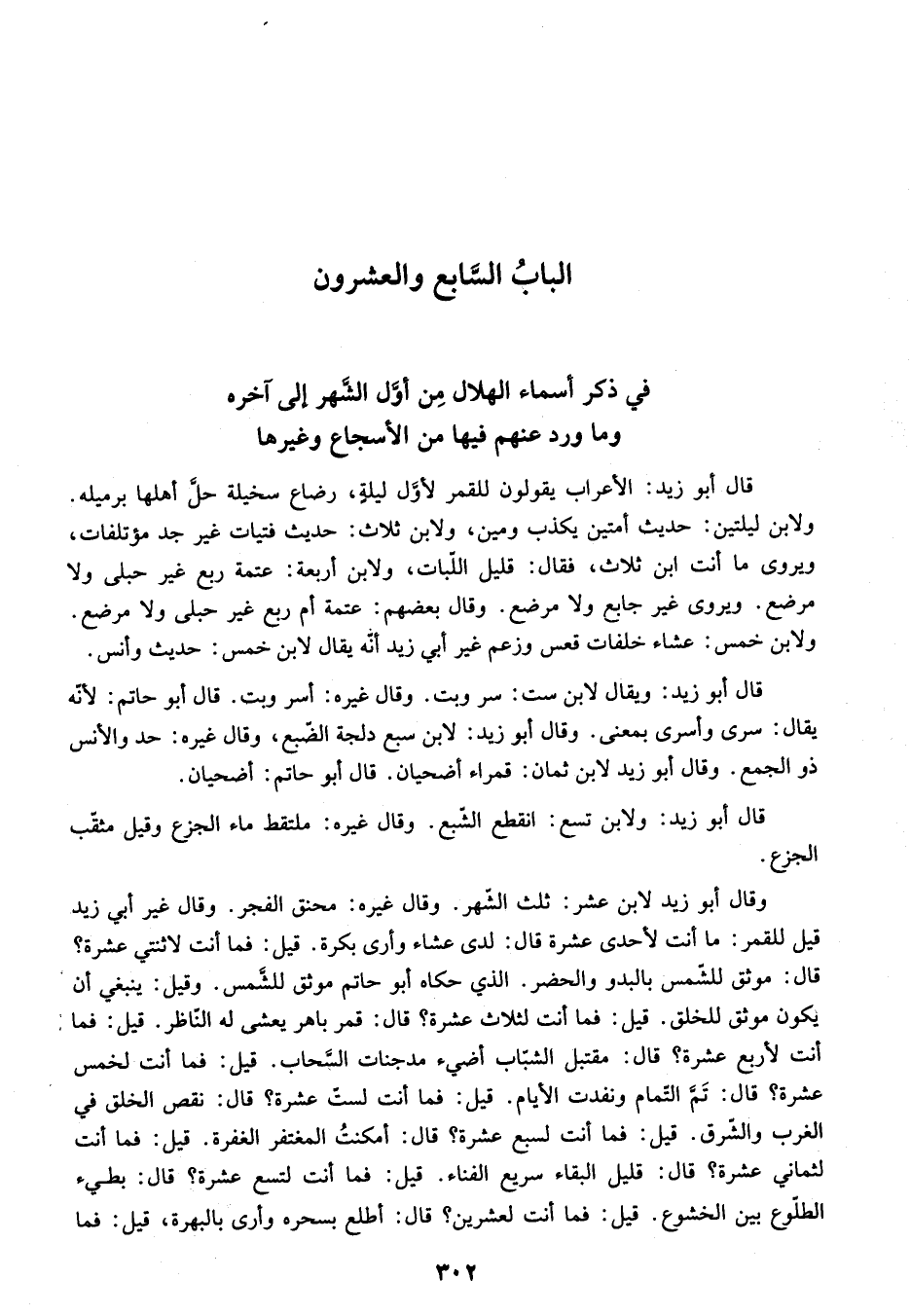 قال أبو زيد: ويقال لابن ست: سر وبت. وقال غيره: أسر وبت. قال أبو حاتم: لأنّه يقال: سرى وأسرى بمعنى. وقال أبو زيد: لابن سبع دلجة الضّبع، وقال غيره: حد والأنس ذو الجمع. وقال أبو زيد لابن ثمان: قمراء أضحيان. قال أبو حاتم: أضحيان.