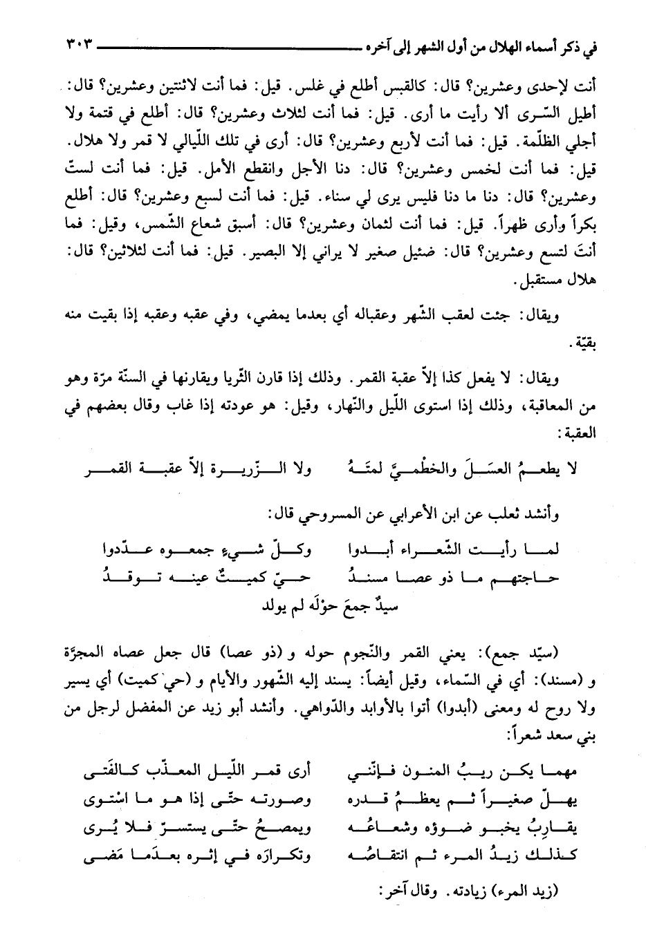 أطيل السّرى ألا رأيت ما أرى. قيل: فما أنت لثلاث وعشرين؟ قال: أطلع في قتمة ولا أجلي الظّلمة. قيل: فما أنت لأربع وعشرين؟ قال: أرى في تلك اللّيالي لا قمر ولا هلال.