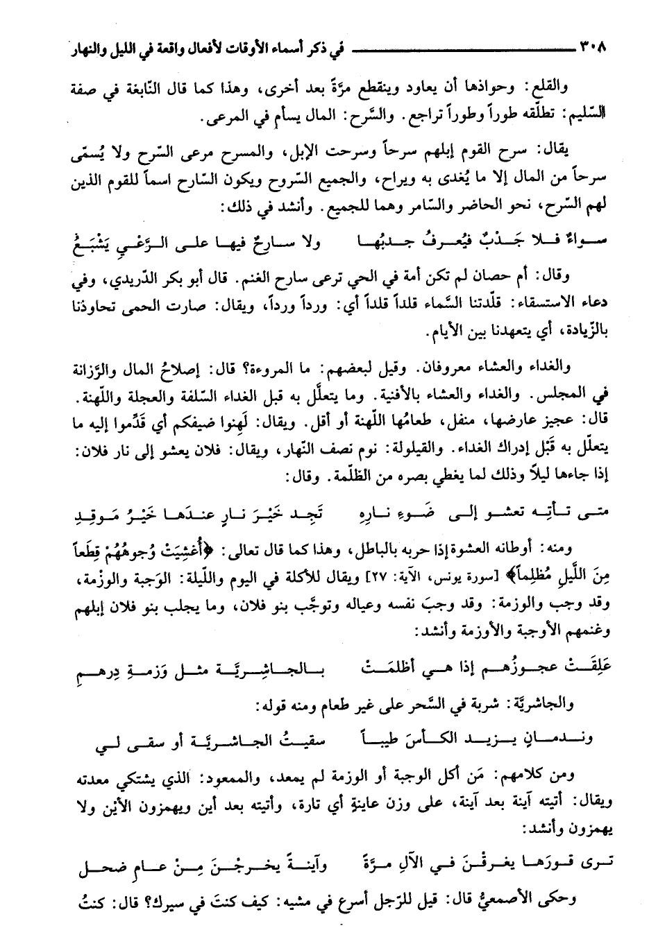 قال: عجيز عارضها، منفل، طعامها اللهنة أو أقل. ويقال: لهنوا ضيفكم أي قدّموا إليه ما يتعلّل به قبل إدراك الغداء. والقيلولة: نوم نصف النّهار، ويقال: فلان يعشو إلى نار فلان: